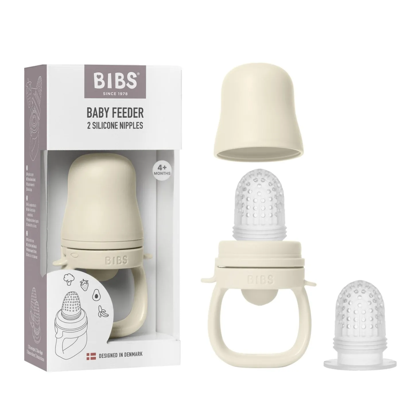 Bibs Ivory Baby Feeder leveres med to silikonesutter og er kompatibel med BIBS fryseskål, hvilket gør den nem at bruge og rengøre. Den er fremstillet af BPA-fri materialer og dansk design, der sikrer høje sikkerhedsstandarder og gør den velegnet til børn fra 4 måneder og opefter. Uanset om det er til daglig stimulering af sanserne eller som støtte under tandfrembruddet, vil denne feeder give komfort og underholdning til dit barn.