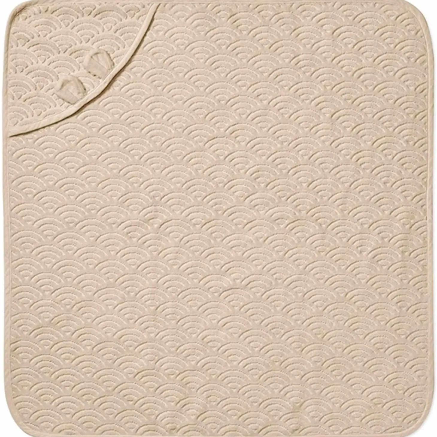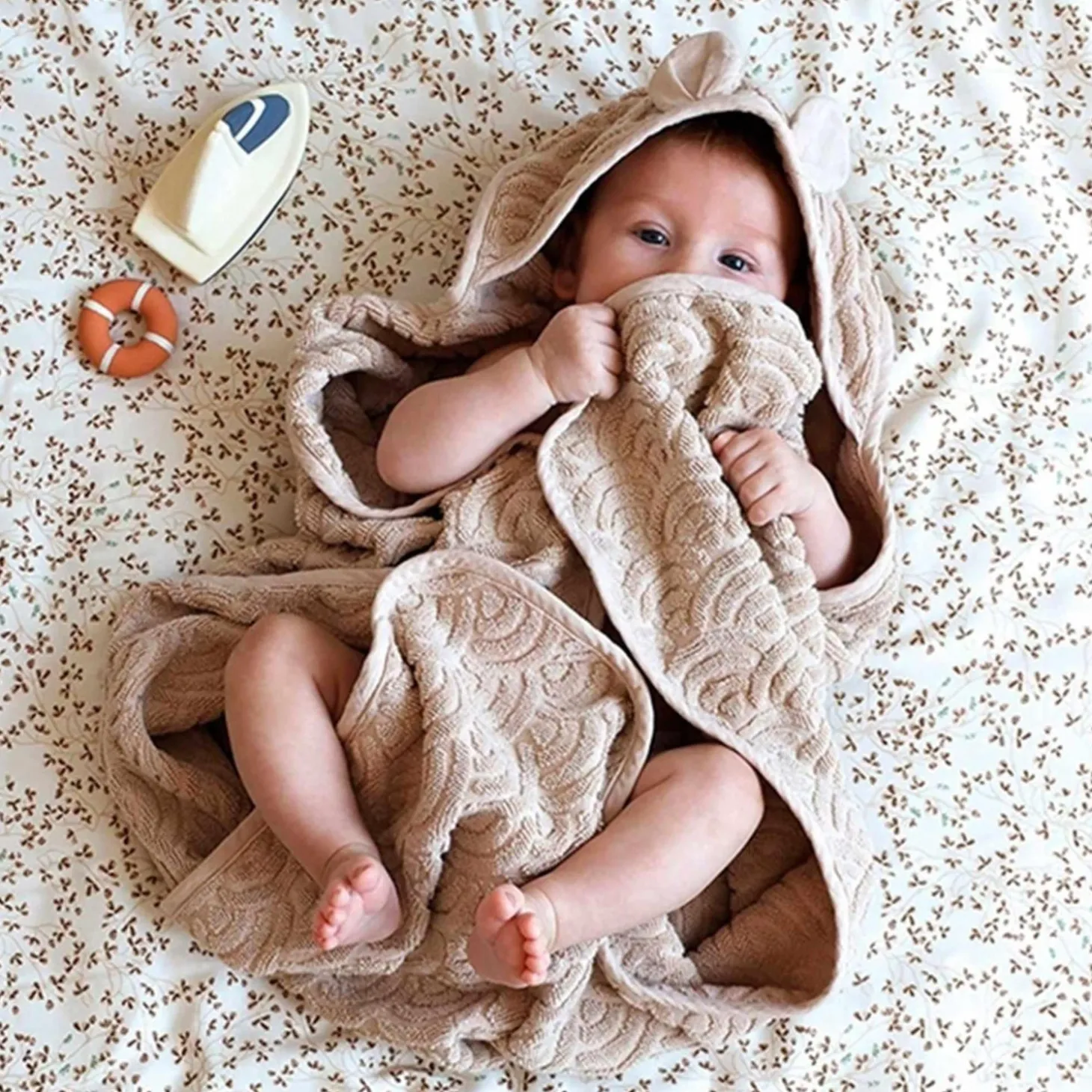 Med dimensionerne 80×80 cm er dette håndklæde ideelt til at pakke din baby ind og holde dem varme og hyggelige. Det praktiske ombuk på hætten tilføjer en ekstra charme til designet og gør det endnu mere funktionelt.
