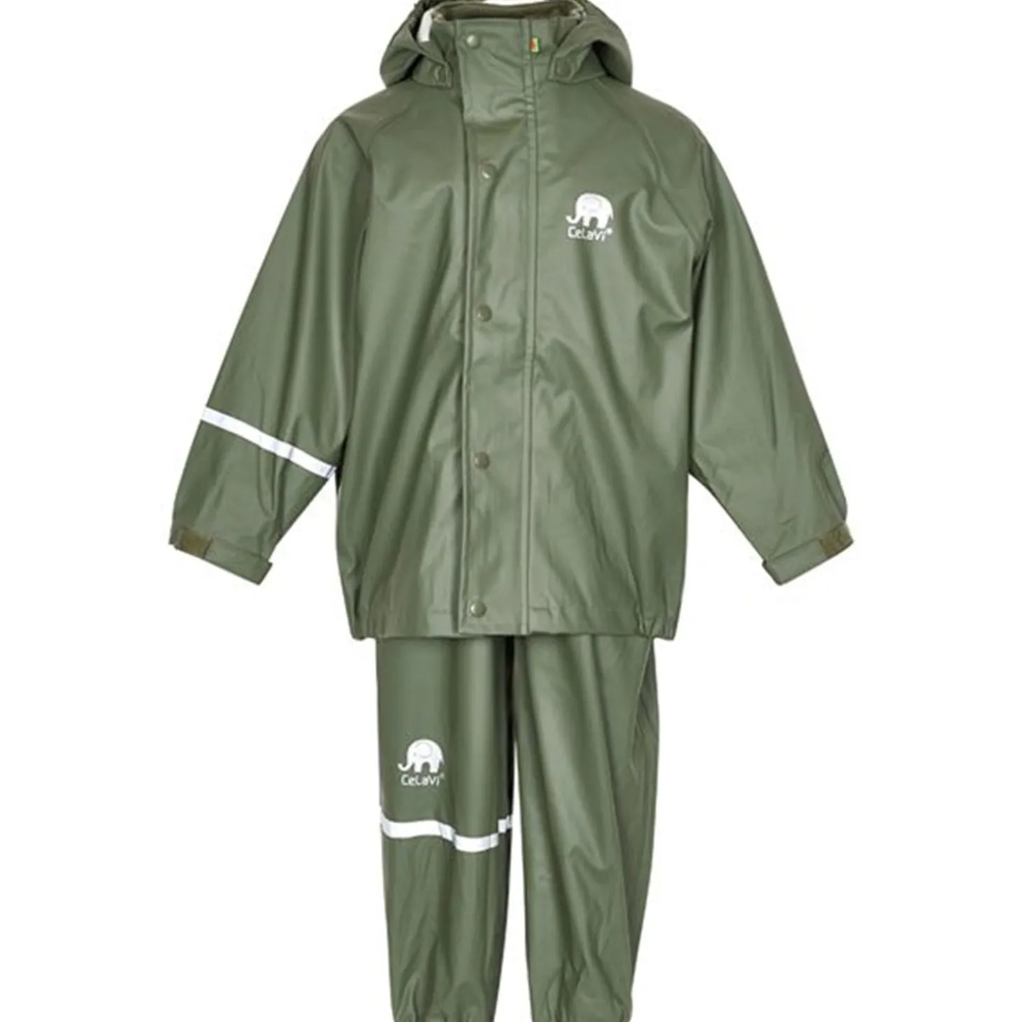Dit barn vil elske at udforske det våde vejr iført CeLaVi Regnsæt Basis Army. Dette praktiske PU-regnsæt er 100% vind- og vandtæt med en imponerende vandsøjletryk på 5000 mm. Med en god pasform, der passer til både drenge og piger, har dette regnsæt mange smarte funktioner.