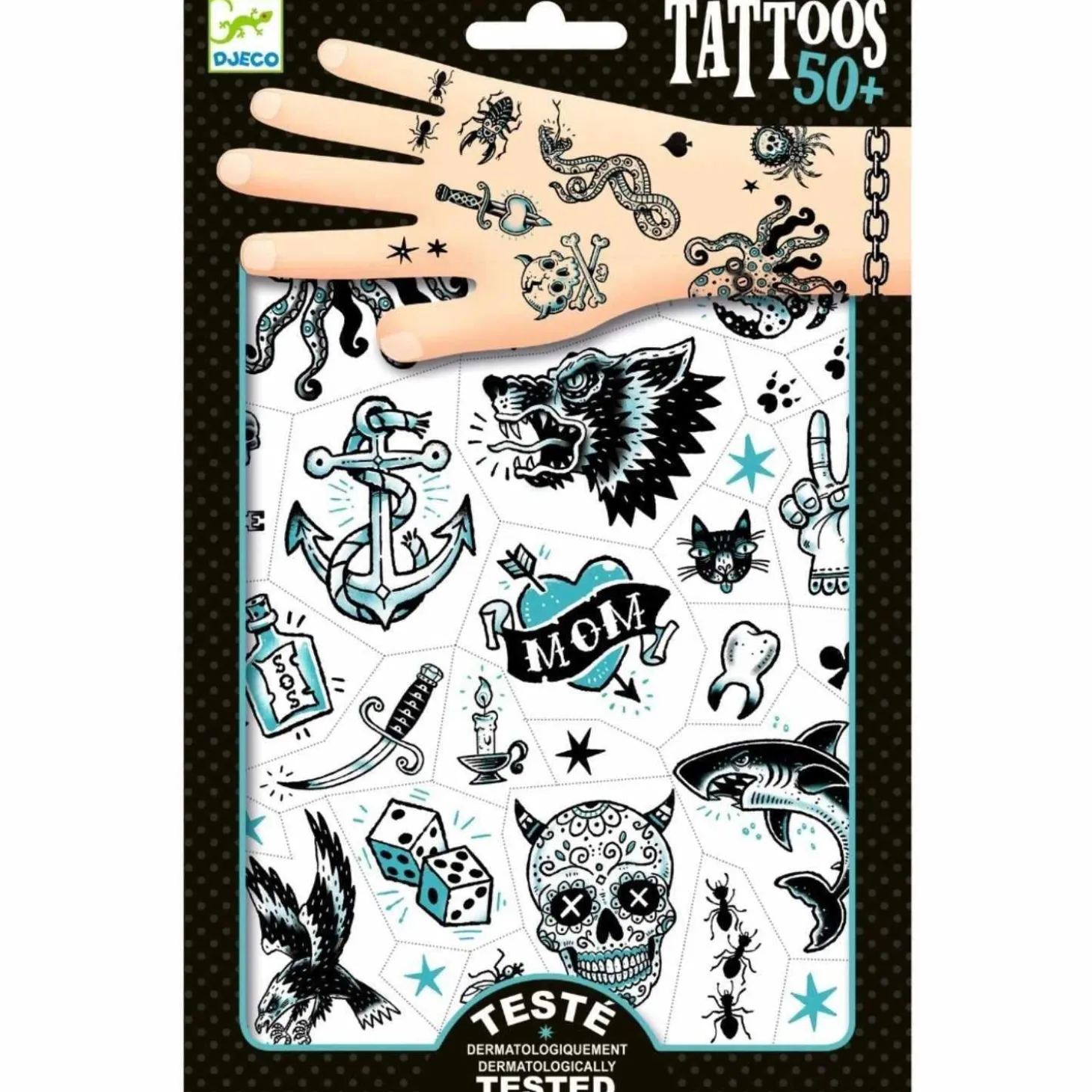Med en let anvendelse kan børnene vælge deres favoritdesign, placere det på huden og bruge en våd klud til at overføre det. Efter et øjeblik kan de forsigtigt fjerne papiret for at afsløre det smukke, detaljerede mønster. Djeco har fokuseret på både sikkerhed og kvalitet, da alle tatoveringer er dermatologisk testet.