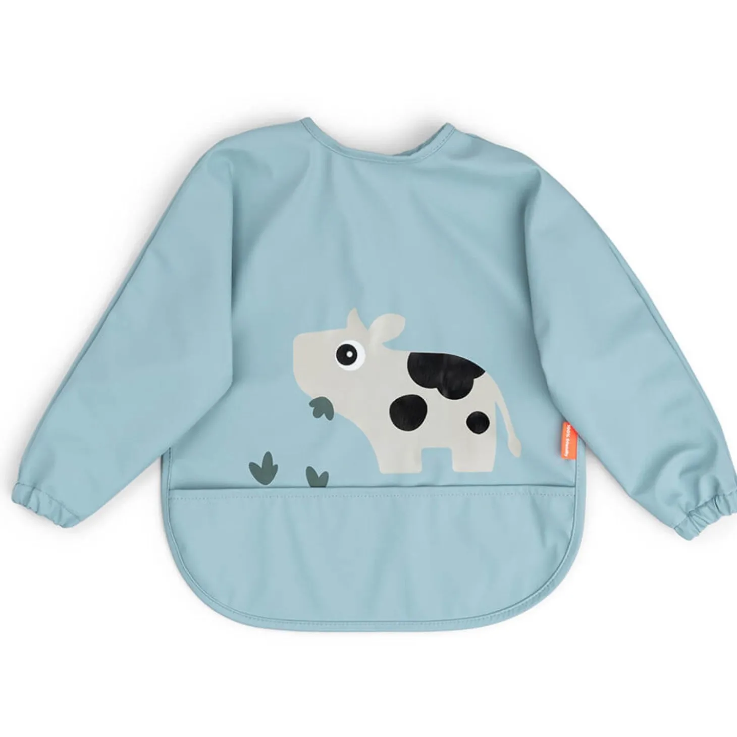 DonebyDeer Blå Hagesmæk m/Ærmer og lomme Tiny farm er den perfekte følgesvend til dit barns måltider! Med fokus på sikkerhed og komfort er denne hagesmæk certificeret til at opfylde høje standarder, så du kan have ro i sindet.