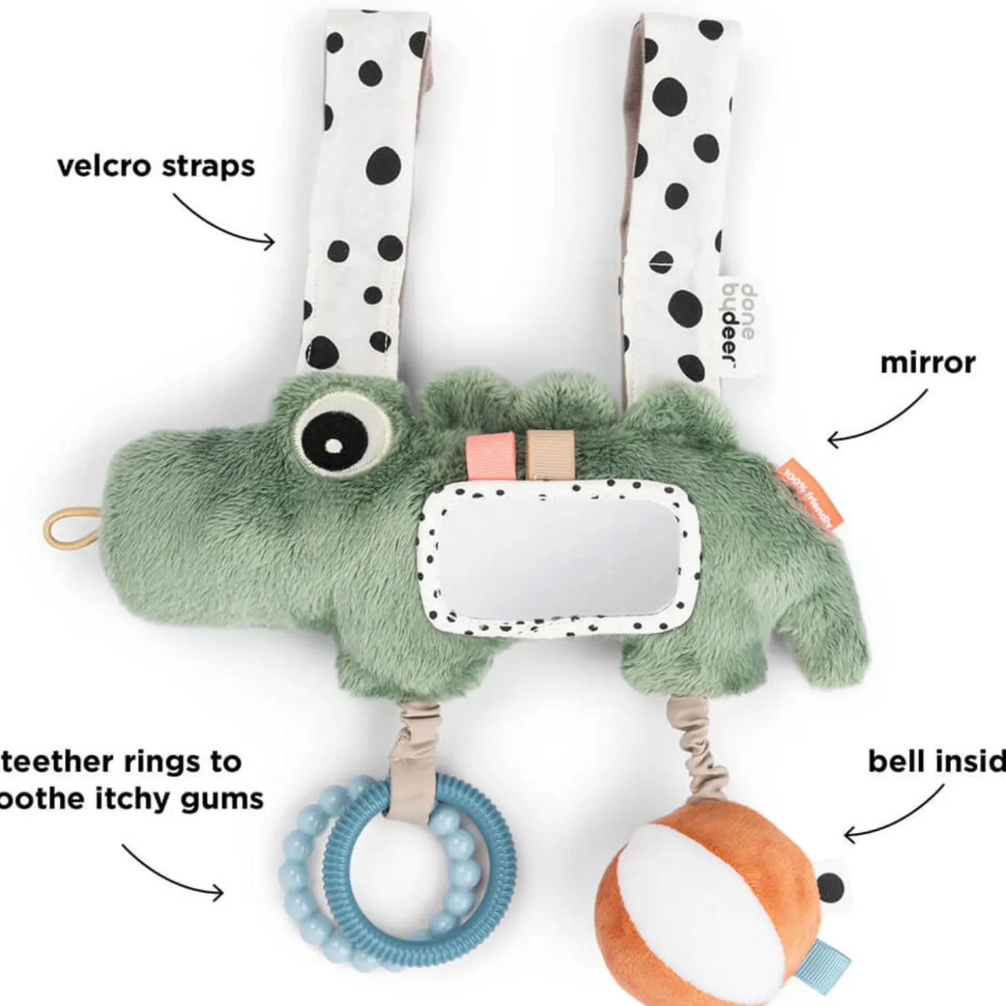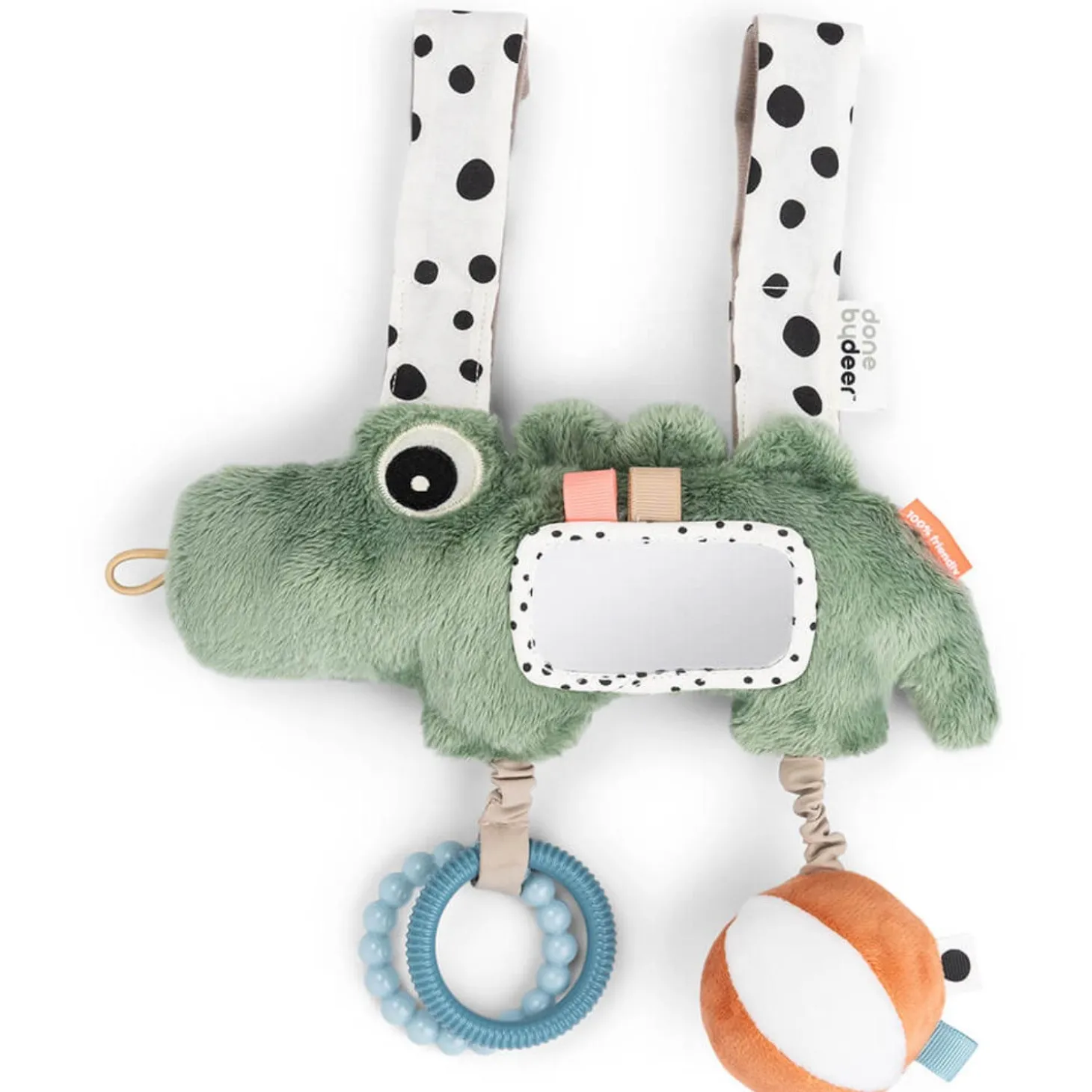 Med DonebyDeer Grøn Aktivitetsophæng Croco kan dit barn nyde timevis af sjov og stimulering. Dette charmerende aktivitetslegetøj er skabt til at fremme dit barns sanser og tidlige udviklingstrin. Croco er designet med børnevenlige materialer, der sikrer sikker leg og nem rengøring. Den er let at fastgøre og perfekt til små hænder, så den nemt kan tages med overalt.