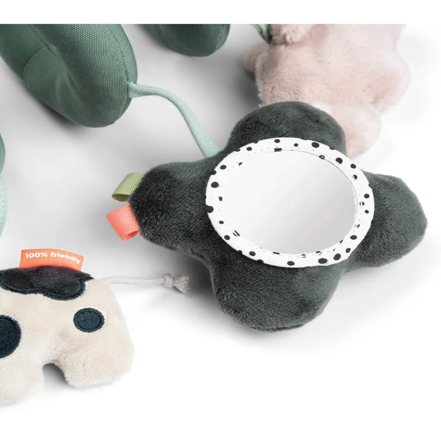 Med sensoriske elementer som en rangle, en klokke og knitren, stimuleres dit barns hørelse og taktile sanser. Lad din baby udforske sig selv og sine refleksioner i spejlet. Den lette spiral kan bindes på sengen, autostolen eller barnevognen og har en sej grøn farve med farverige detaljer og kontraster for visuel stimulering. Deer friends underholder dit barn, mens I er på farten.