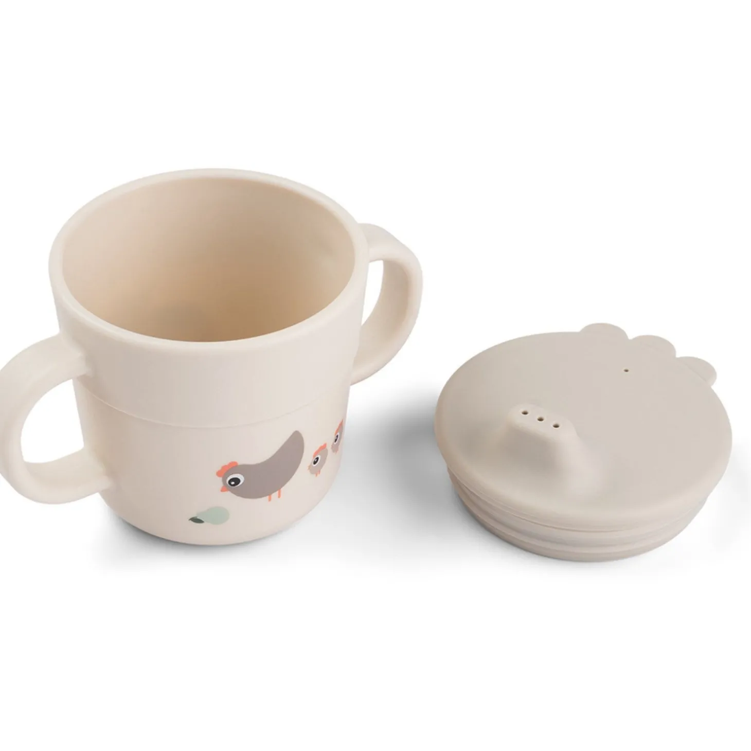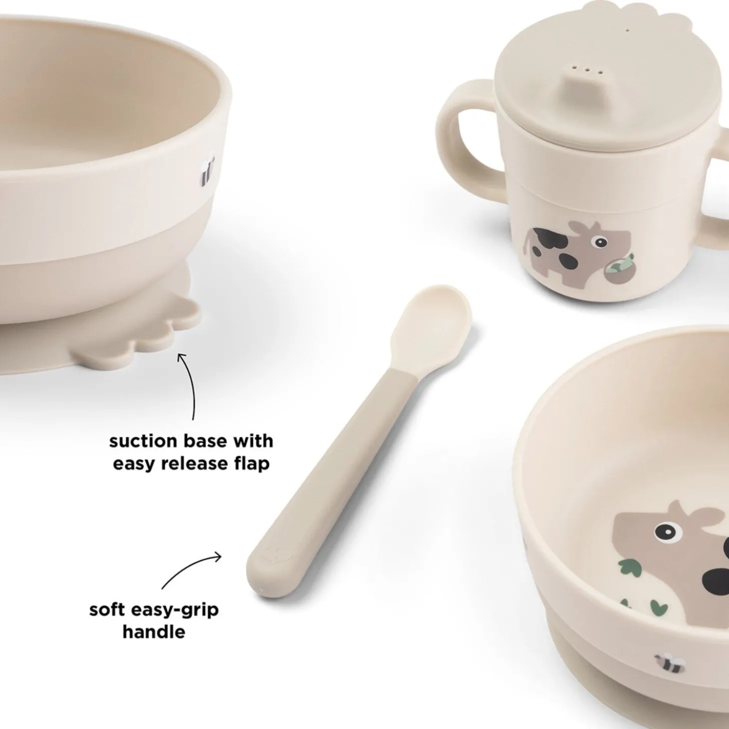 Opdag DonebyDeer Sand Foodie Første Spisesæt Med Sugekop Tiny Farm, der kombinerer sjov og sikkerhed under måltiderne. Den smarte sugekopbase på skålen holder den på plads, hvilket reducerer spild og rod, mens den bløde ske gør det nemt for små hænder at gribe om. Det elegante sandfarvede design med Clucky- og Dotti-motiver stimulerer barnets nysgerrighed og gør måltiderne mere spændende. Ideel til at fremme selvstændig spisning og udforske nye fødevarer på en tryg og behagelig måde.