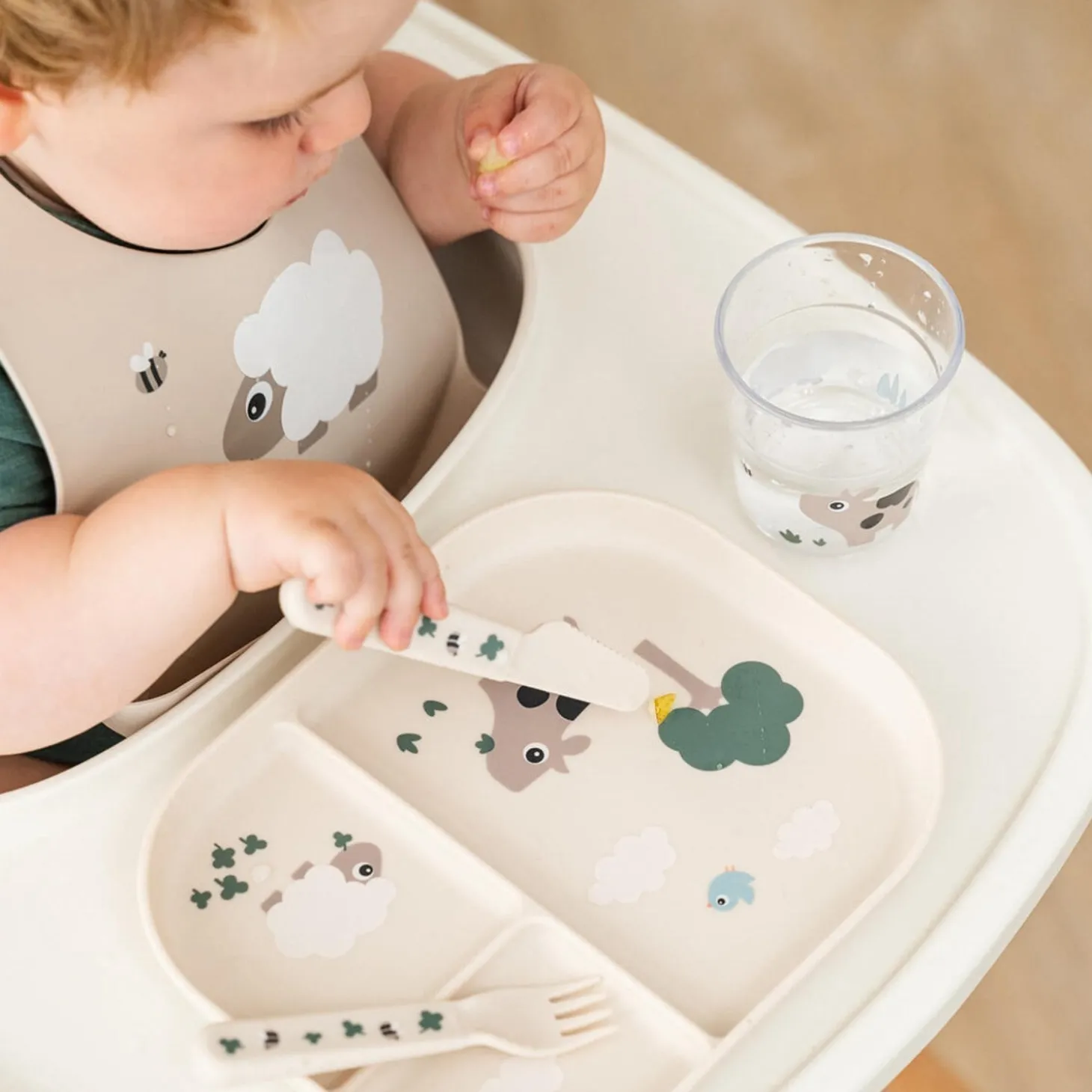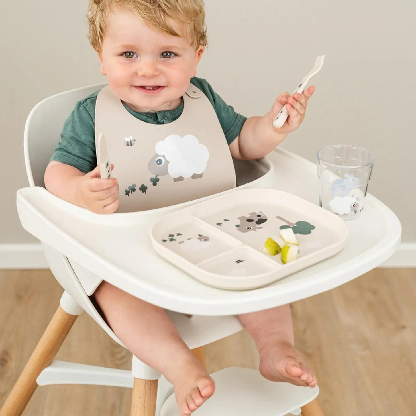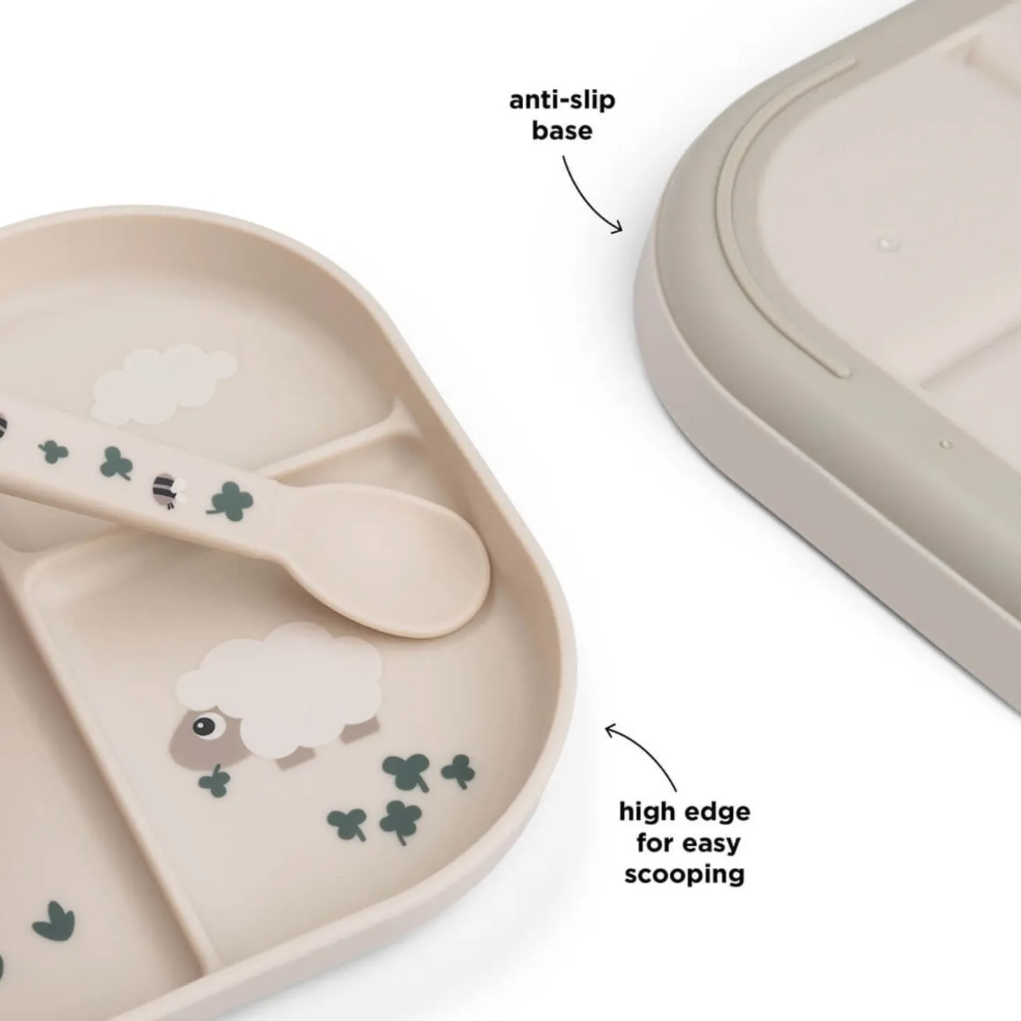 Med sit charmerende design i sandfarve og motivet af Sheepy og Dotti vil denne tallerken ikke kun glæde dit barn, men også lette din hverdag. Lad dit barn nyde måltiderne med stil og sikkerhed!