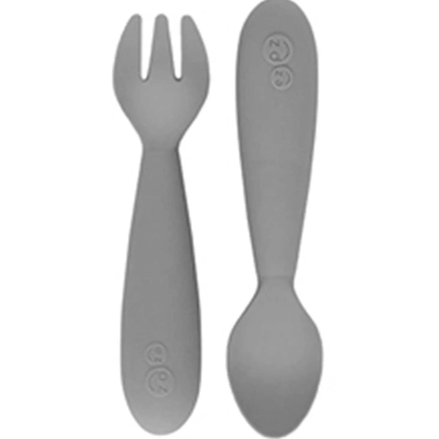 Oplev Ezpz Mini Bestiksæt i en elegant grå farve, lavet af 100% fødevaregodkendt silikone. Dette sæt består af en ske og en gaffel, designet med lette greb perfekte til små hænder. Ideel som en sød gave til fødselsdag, barsel eller dåb.