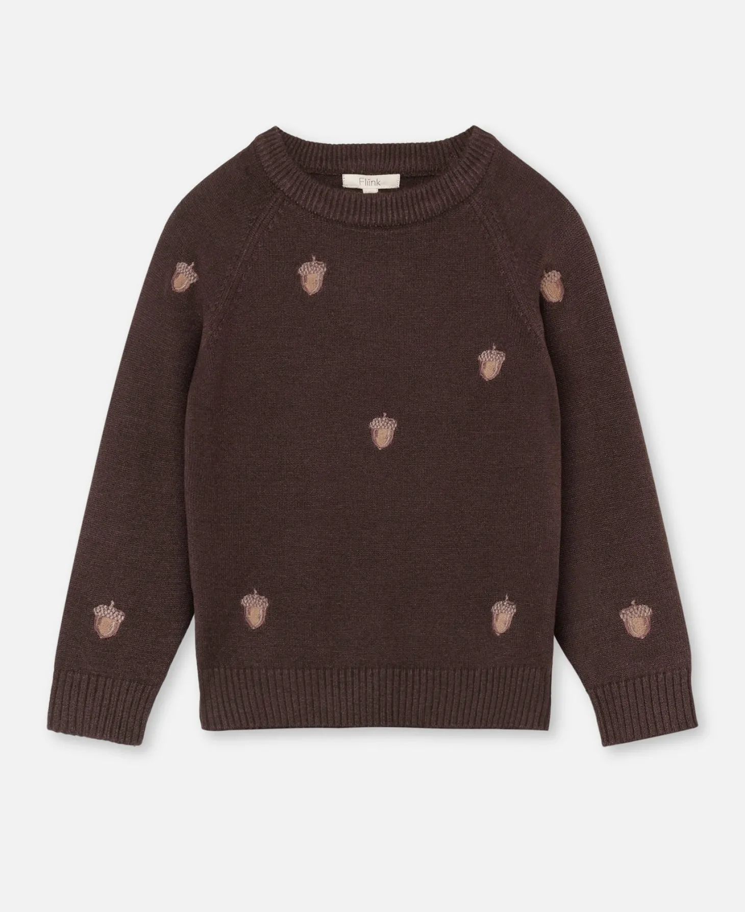 Blød og varm strikket pullover med søde, broderede agern motiver, der tilføjer et legende og naturligt præg. Pulloveren har ribkanter ved både hals og ærmeafslutninger samt en klassisk pasform med raglanærmer, der giver et tidløst og komfortabelt udtryk.