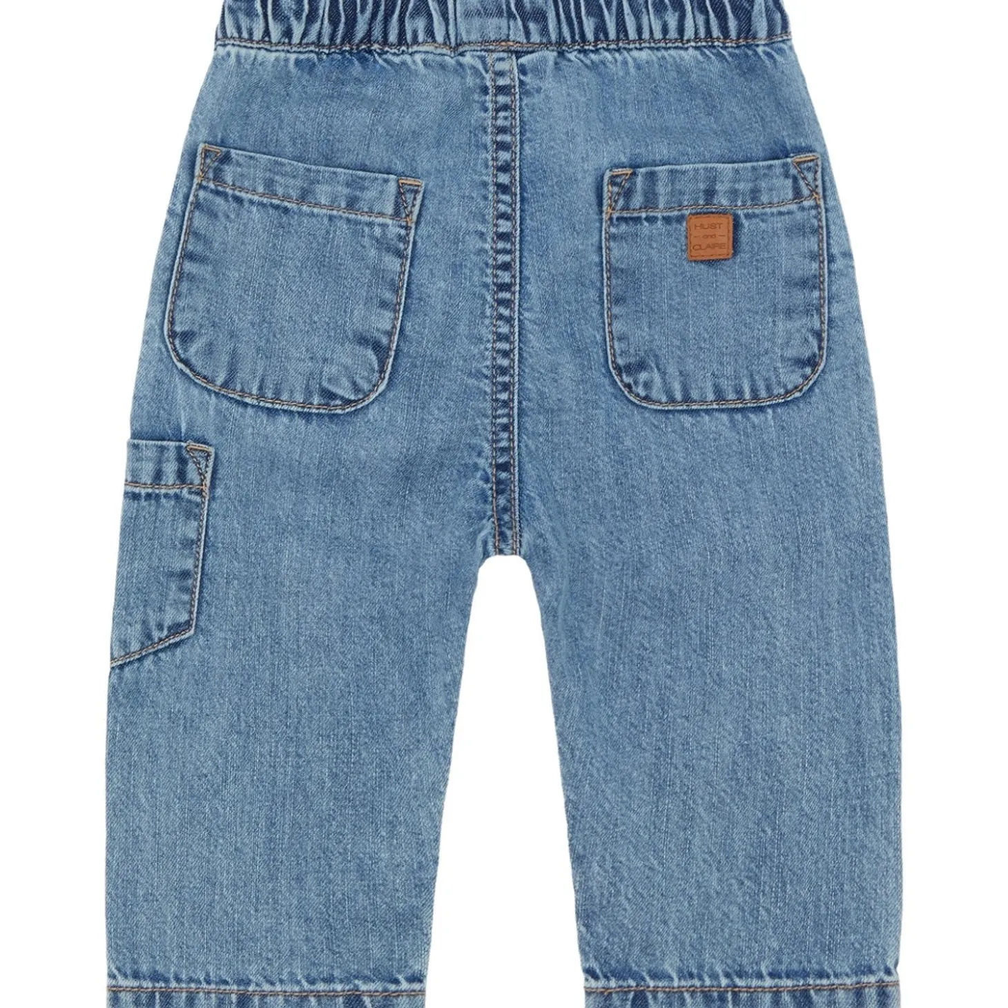 Opdag de nye Hust & Claire Washed Denim Joe Jeans, det perfekte tilføjelse til dit barns garderobe. Disse jeans er lavet af blød denim med elastik i taljen, hvilket sikrer en behagelig løs pasform, perfekt til leg og aktivitet. Det klassiske design får et moderne twist med en ekstra lomme på venstre bukseben, praktiske for- og baglommer samt en justerbar talje, der sikrer en perfekt pasform, selv når dit barn vokser.