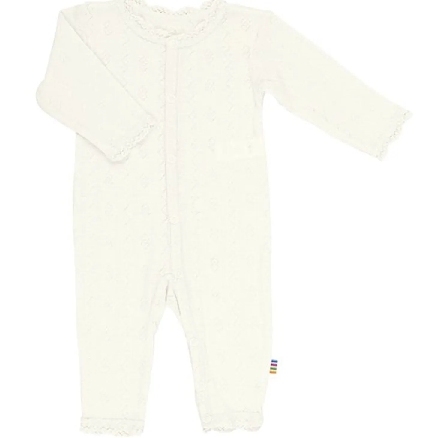 Den er lavet i en flot hvid farve og fremstillet af en blanding af 85% Merino uld og 15% silke, hvilket giver en super blød og behagelig fornemmelse for de mindste. Ulden hjælper med at regulere kropstemperaturen, hvilket gør dragten velegnet til både køligere og varmere vejrforhold.