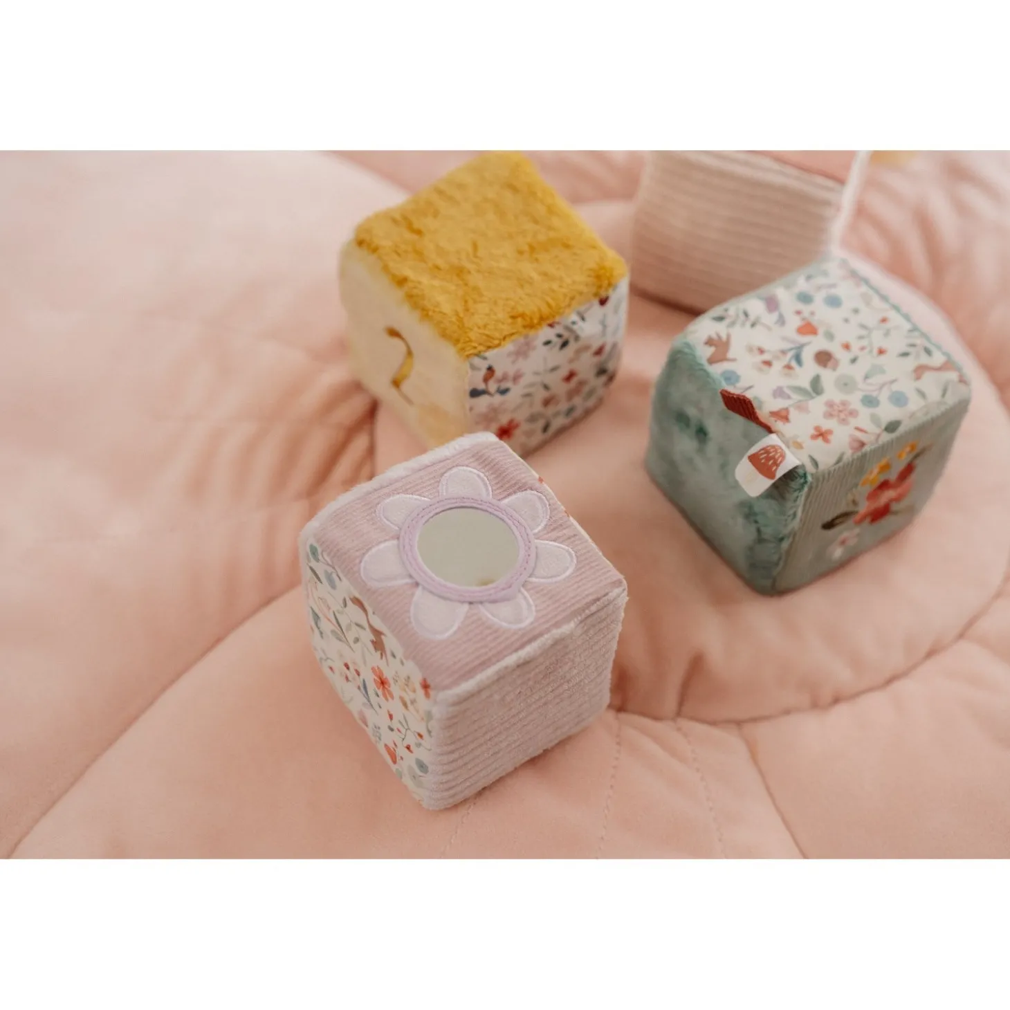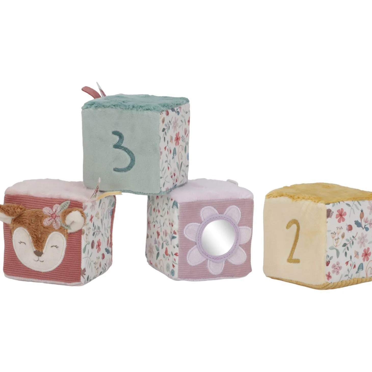 Terningerne er lavet i blød plyskvalitet, som er sikker og behagelig at røre ved. Deres lette design gør dem nemme for små hænder at gribe, hvilket er ideelt for børn helt fra nyfødt. Med sjove mærkater, forskellige teksturer og et charmerende blomsterspejl tilbyder disse terninger både underholdning og uddannelse.