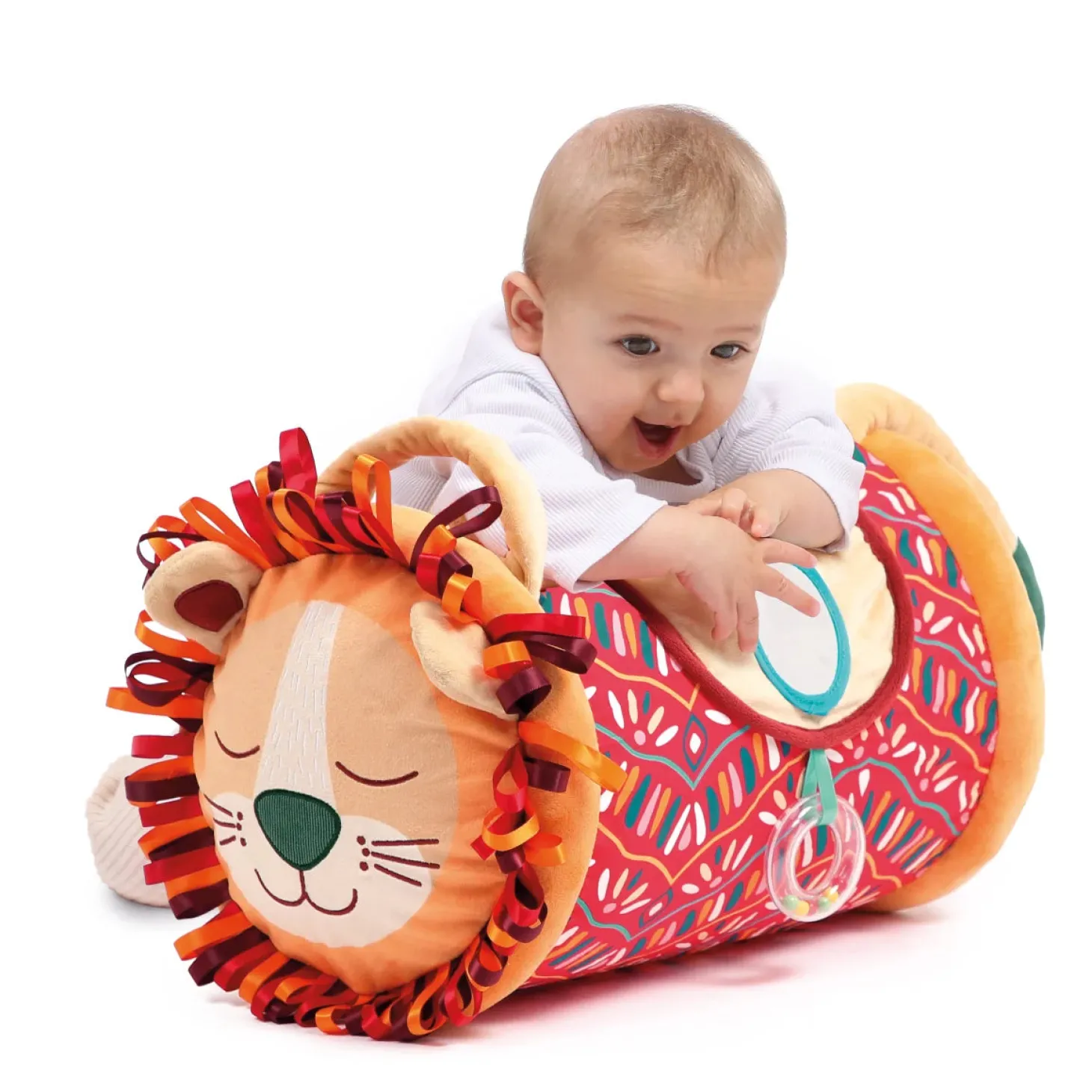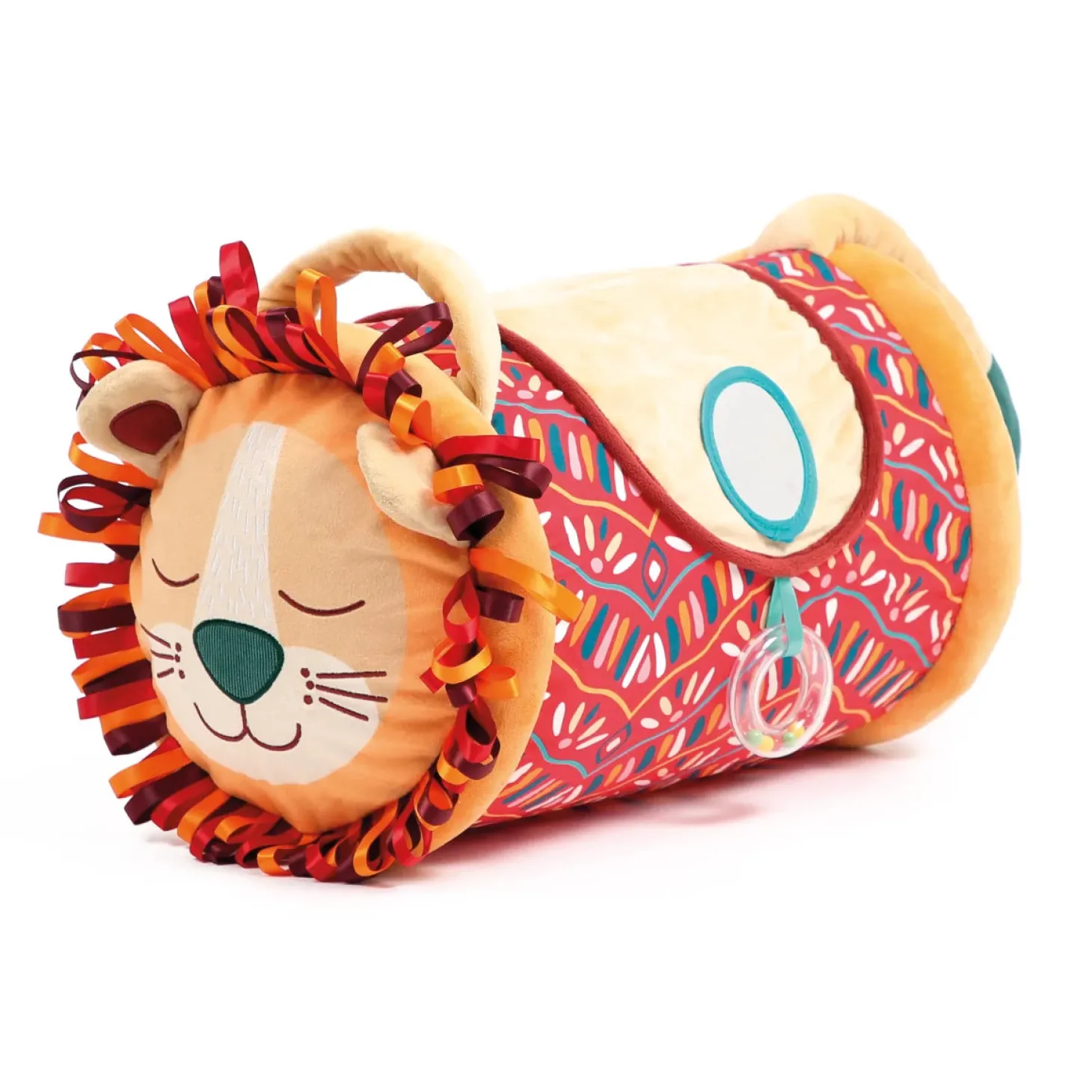 Cylinderen har meget bløde teksturer og sanseaktiviteter som et spejl, til at stimulere synet og klokker til at forfine hørelsen.