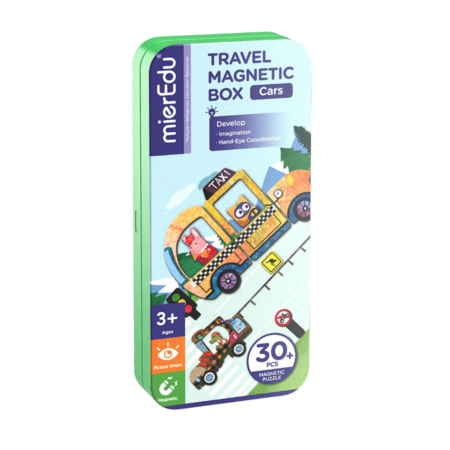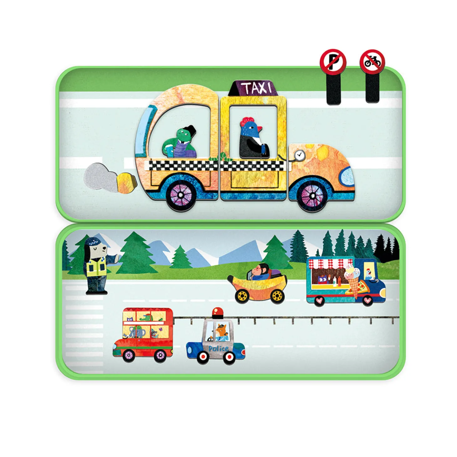 Dette magnetiske legesæt med bil-tema indeholder to baggrunde og mere end 30 magnetiske brikker til at sammensætte sine egen figurer og finde på sjove historier.