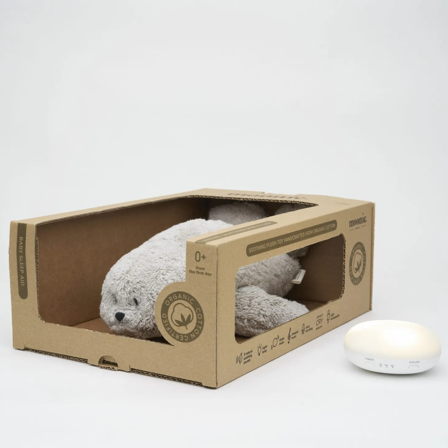 Moonie sælen er fremstillet i økologisk bomuld og udstyret med genopladelig lyd- og lysmodul. Den er nem at bruge, sikker for selv nyfødte og en smuk del af både soveværelset og hverdagen.