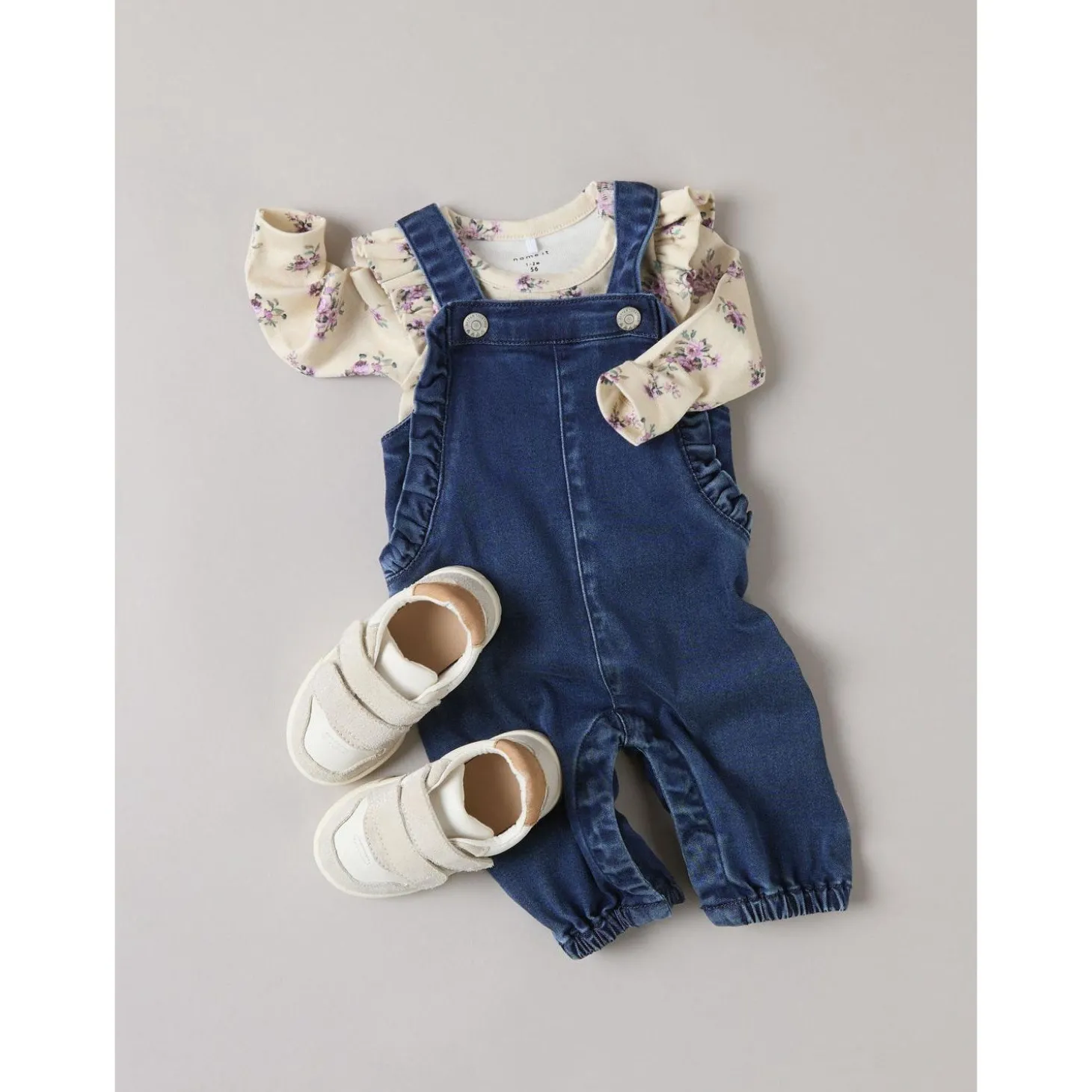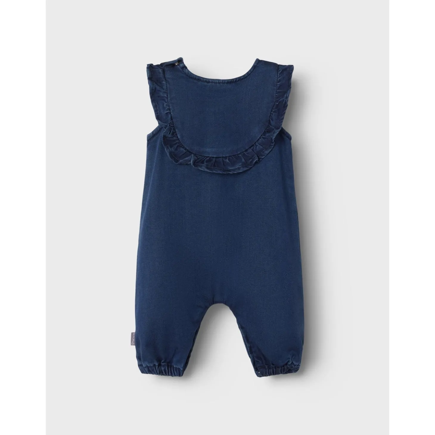 Med en klassisk mørkeblå farve og trendy flæser tilføjer denne dragt et legesygt og unikt touch til dit barns garderobe. Praktiske trykknapper i skridtet gør påklædning og afklædning en leg, perfekt til travle dage. Elastiske kanter sikrer en behagelig pasform, mens den almindelige pasform giver masser af bevægelsesfrihed.