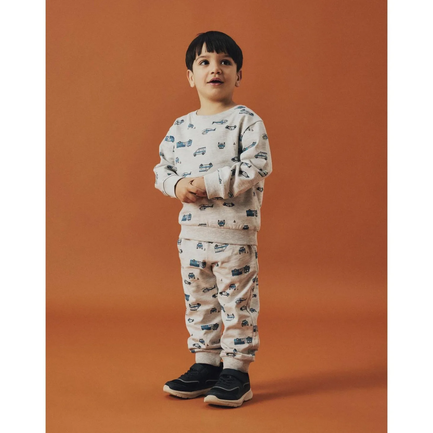 Fremstillet af en blød blanding af bomuld og polyester, sikrer denne sweatshirt ikke kun varme, men også langvarig holdbarhed. Den lys grå melange farve sammen med det gentagne mønster over hele produktet tilføjer en sjov og ungdommelig charme, mens den klassiske runde hals og de lange ærmer med ribmanchetter understreger et tidløst design.