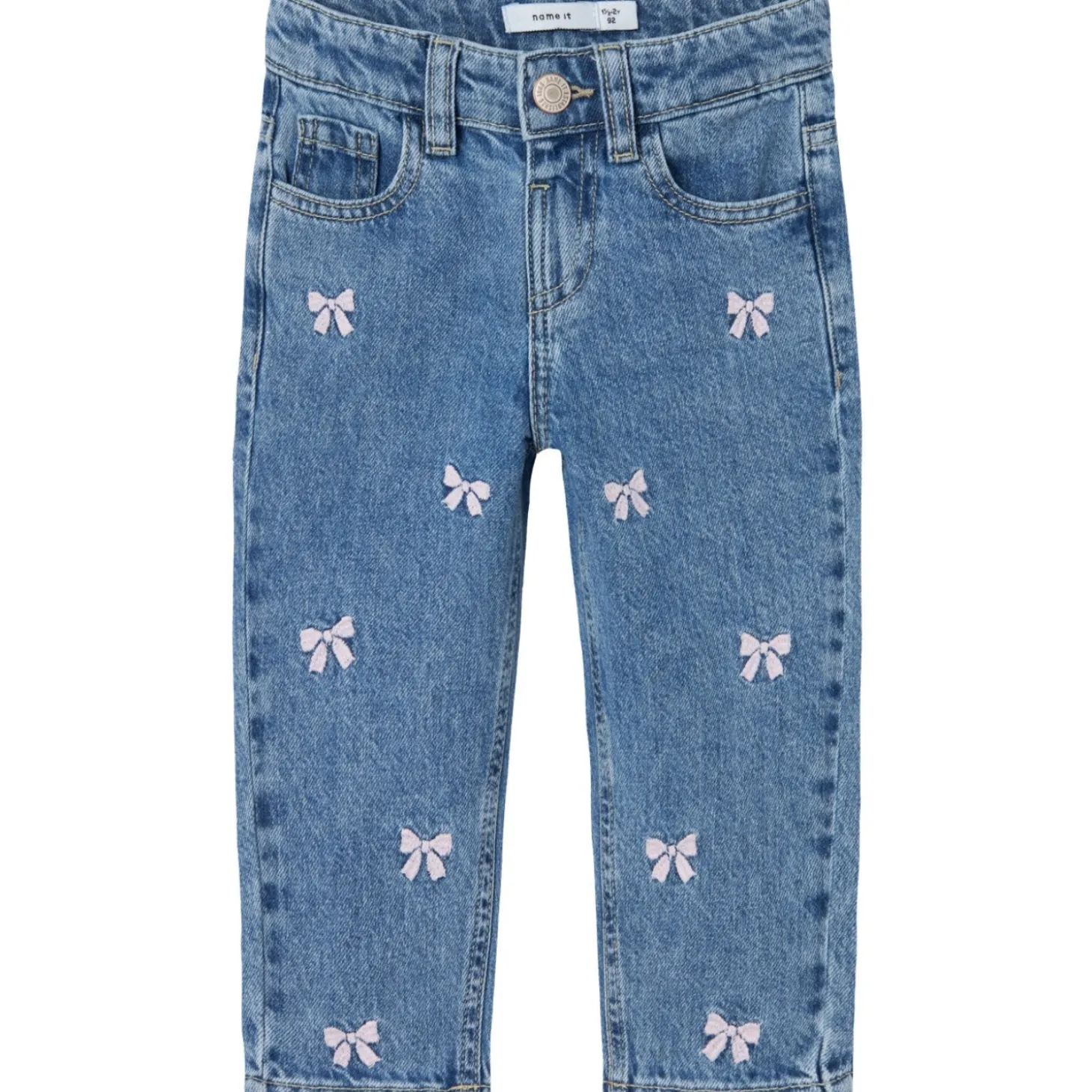 Opgrader dit barns stil med disse moderigtige Name It Medium Blue Denim Bows Bella Mom Embroidery Jeans Noos. Lavet af slidstærkt denimstof med et unikt broderimønster, tilbyder disse jeans en legende finesse og holdbarhed. Med en mom fit pasform, har de en baggy hofte og en fashionable silhuet, perfekt til enhver lejlighed.