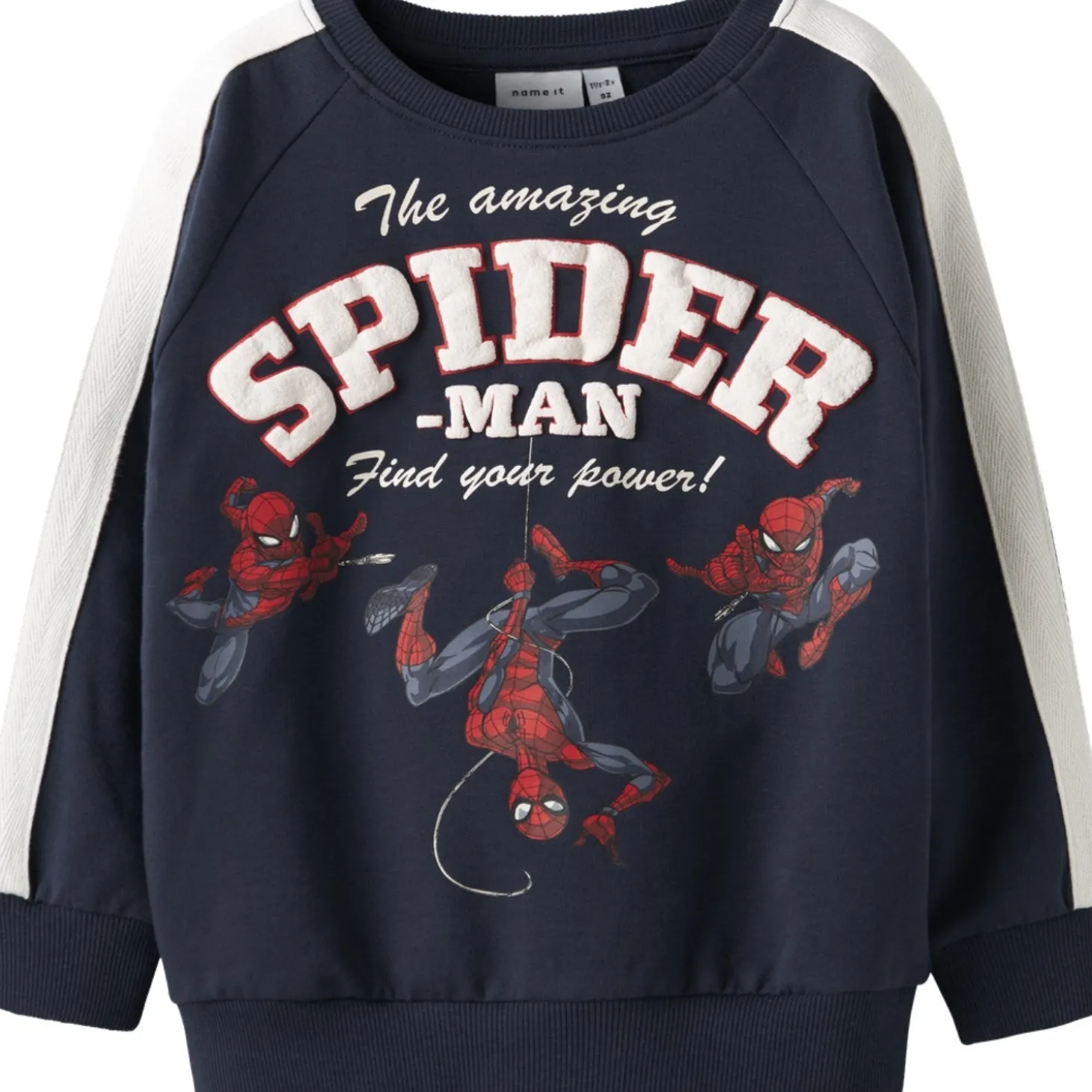 Oplev en ny dimension af komfort med Name It Navy Blazer Nmmobert Spider Nreg Sweat Bru Mar sweatshirten. Lavet af blødt og børstet sweatstof, der sikrer en varm og behagelig fornemmelse hele dagen. Det ikoniske Spider-Man print tilføjer en sej og legende kant til ethvert outfit, mens den runde hals, lange Raglanærmer og praktiske ribmanchetter sikrer en behagelig og fleksibel pasform.