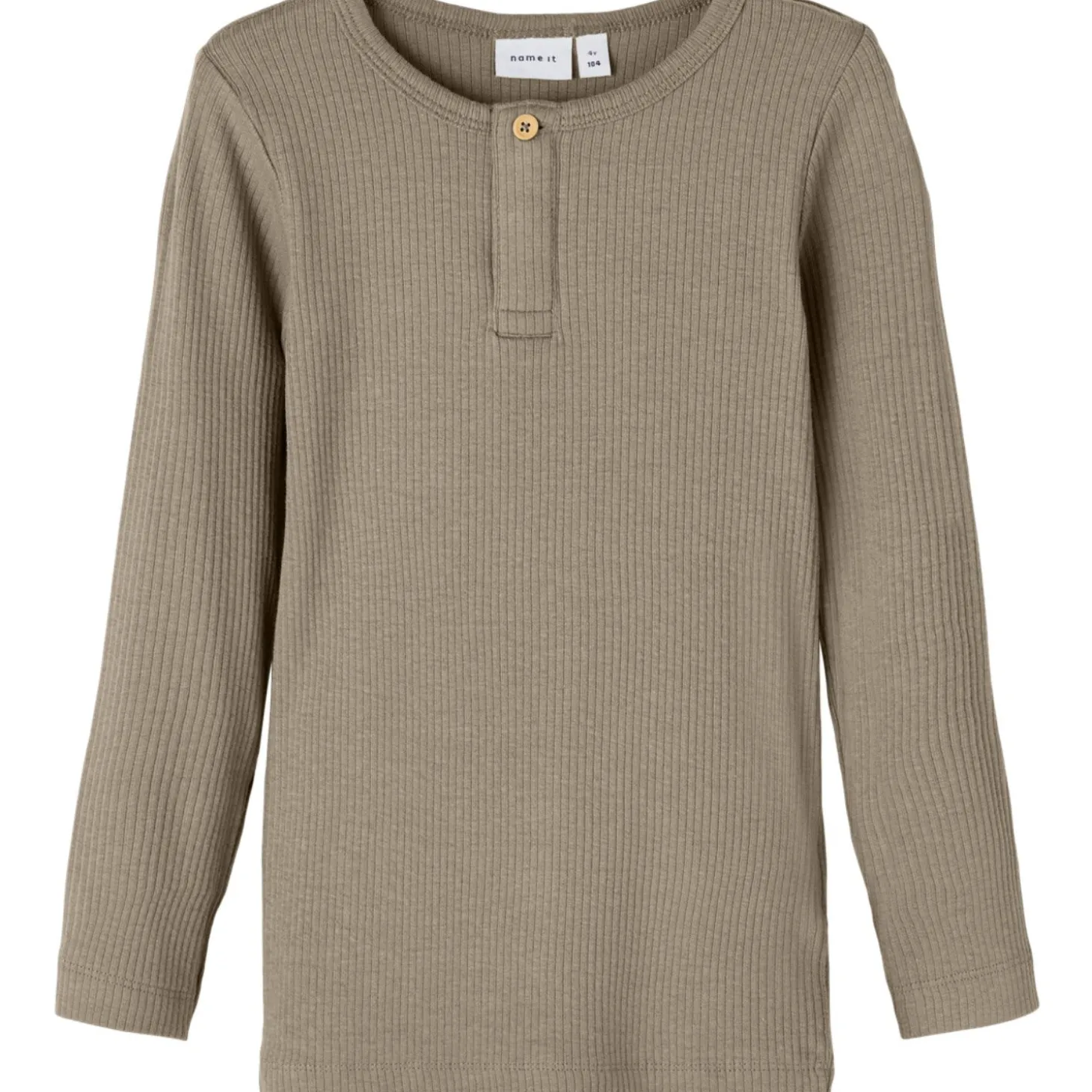 Opgrader din lille éns garderobe med Name It Weathered Teak Kabille Slim Blouse. Denne stilfulde bluse er lavet af blød ribstrik, der sikrer en behagelig og fleksibel pasform takket være stoffets lodrette, stribede mønster og fantastiske elasticitet.