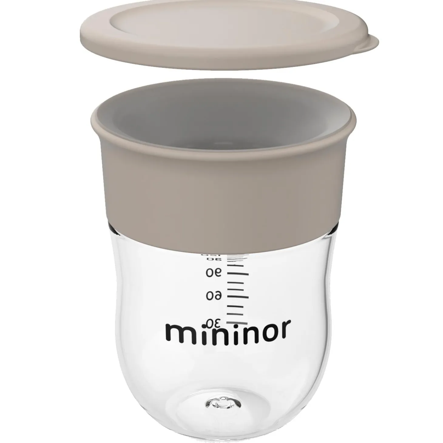 Mininor Træningskoppen er bevidst designet uden håndtag. Dette opmuntrer tumlinger til at holde og gribe fat i koppen som en voksen, hvilket fremmer en følelse af selvstændighed og understøtter udviklingen af finmotorik og hånd-øje-koordination.