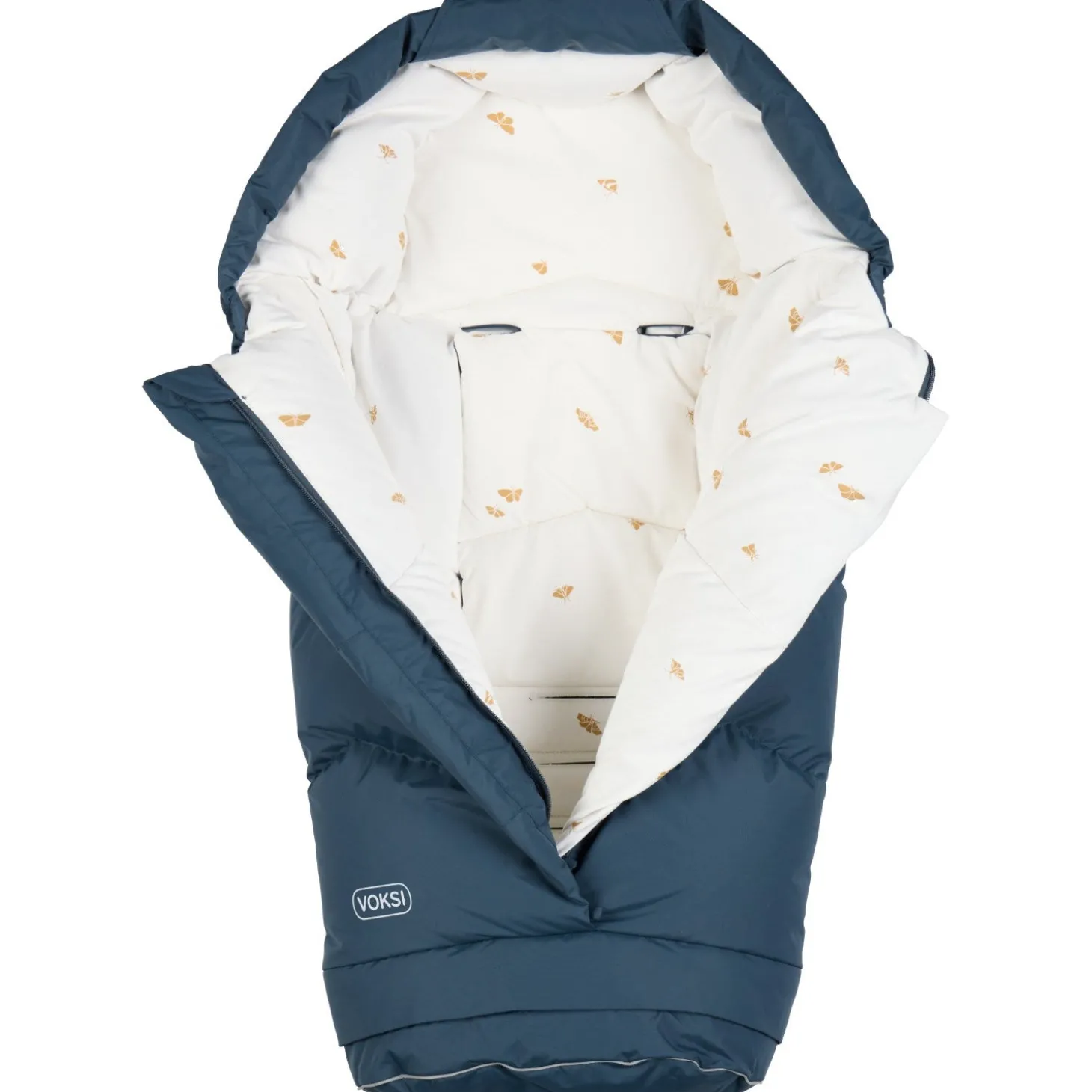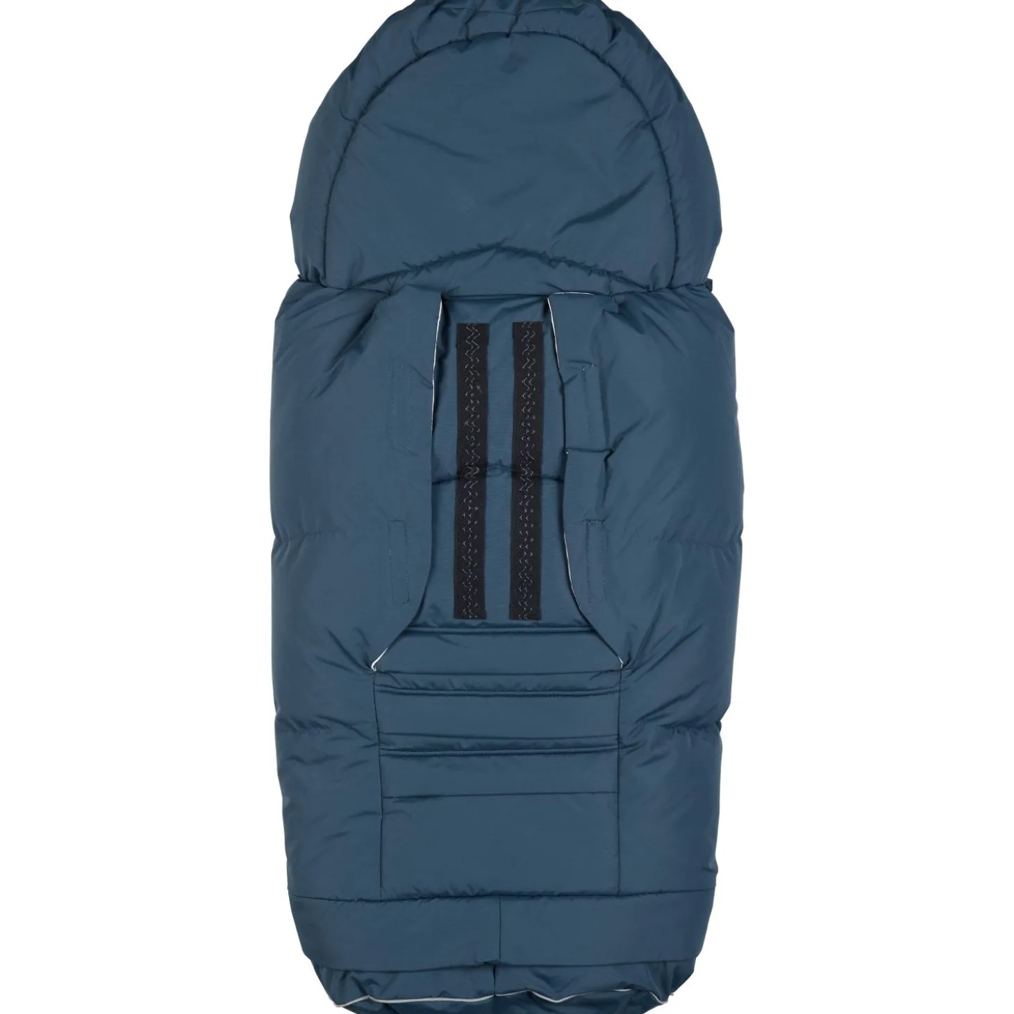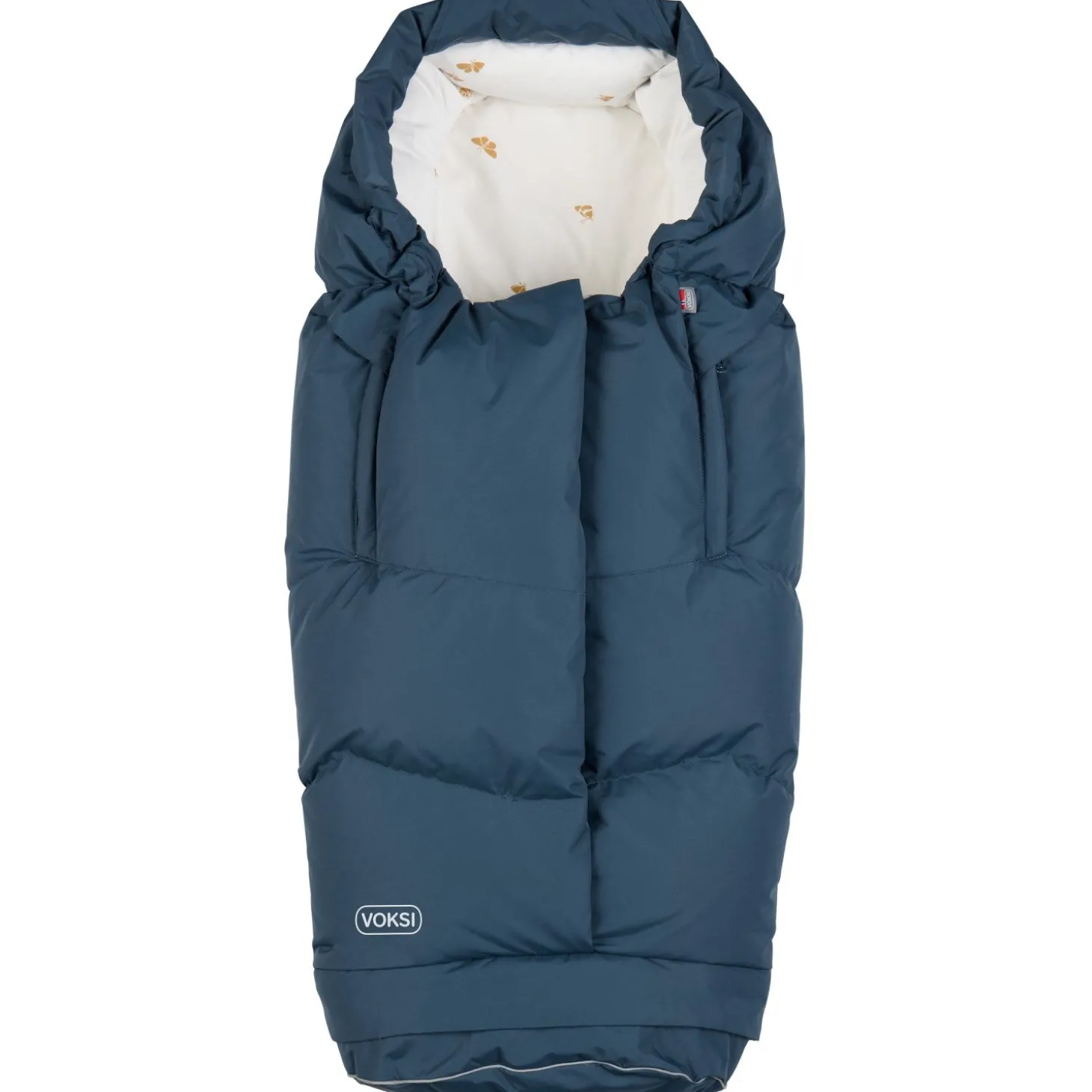 Denne kørepose er fyldt med dun og fjer, der giver naturlig varmeisolering uden at være tung. Med justerbare detaljer som snoretræk i hætten og en forlængerdel kan posen tilpasses barnets størrelse og behov. Det multifunktionelle design med lynlås midtfor gør det nemt at placere barnet i posen og den kan også foldes helt ud og bruges som legetæppe eller dyne.