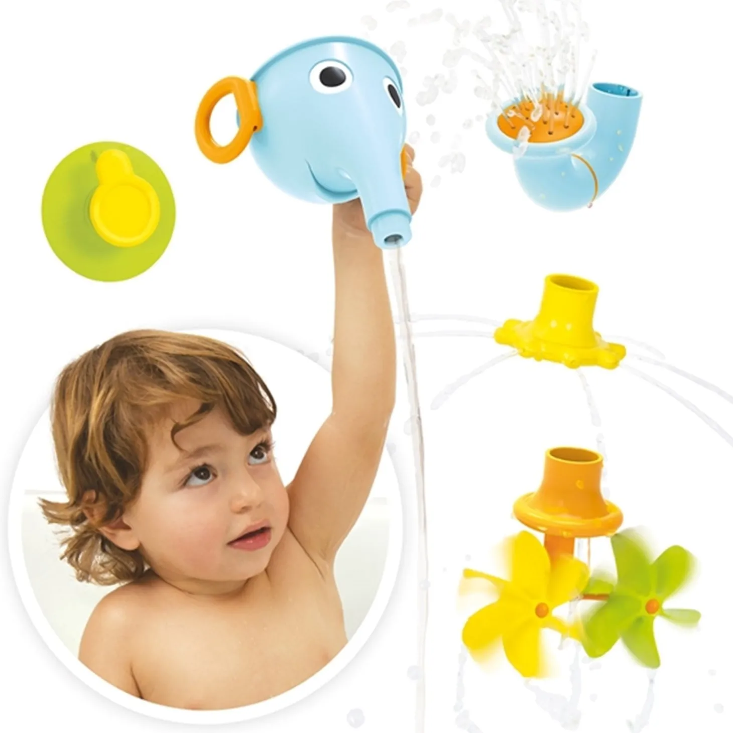 Inkluderet i sættet er en elefant snabeltragt, en rindende vandmølle, en drejet snabelspray, et sprinklermundstykke og en sugekop til ophæng.