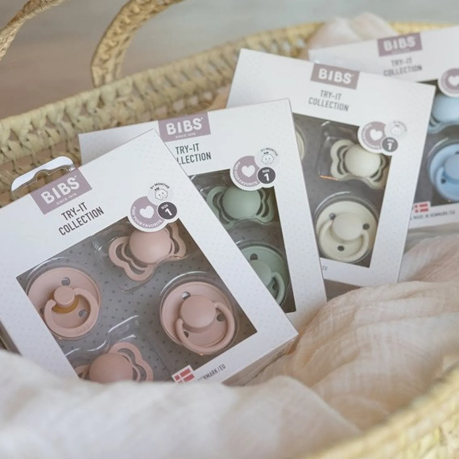 Opdag Bibs Try-it Collection – en pakke med fire skønne sutter i en flot sagegrøn nuance. Hver sut har en unik form, så du kan finde den, som din baby foretrækker. Sutterne anbefales at blive skoldet før brug for sterilisering, og det anbefales at kontrollere sutten regelmæssigt for integritet.