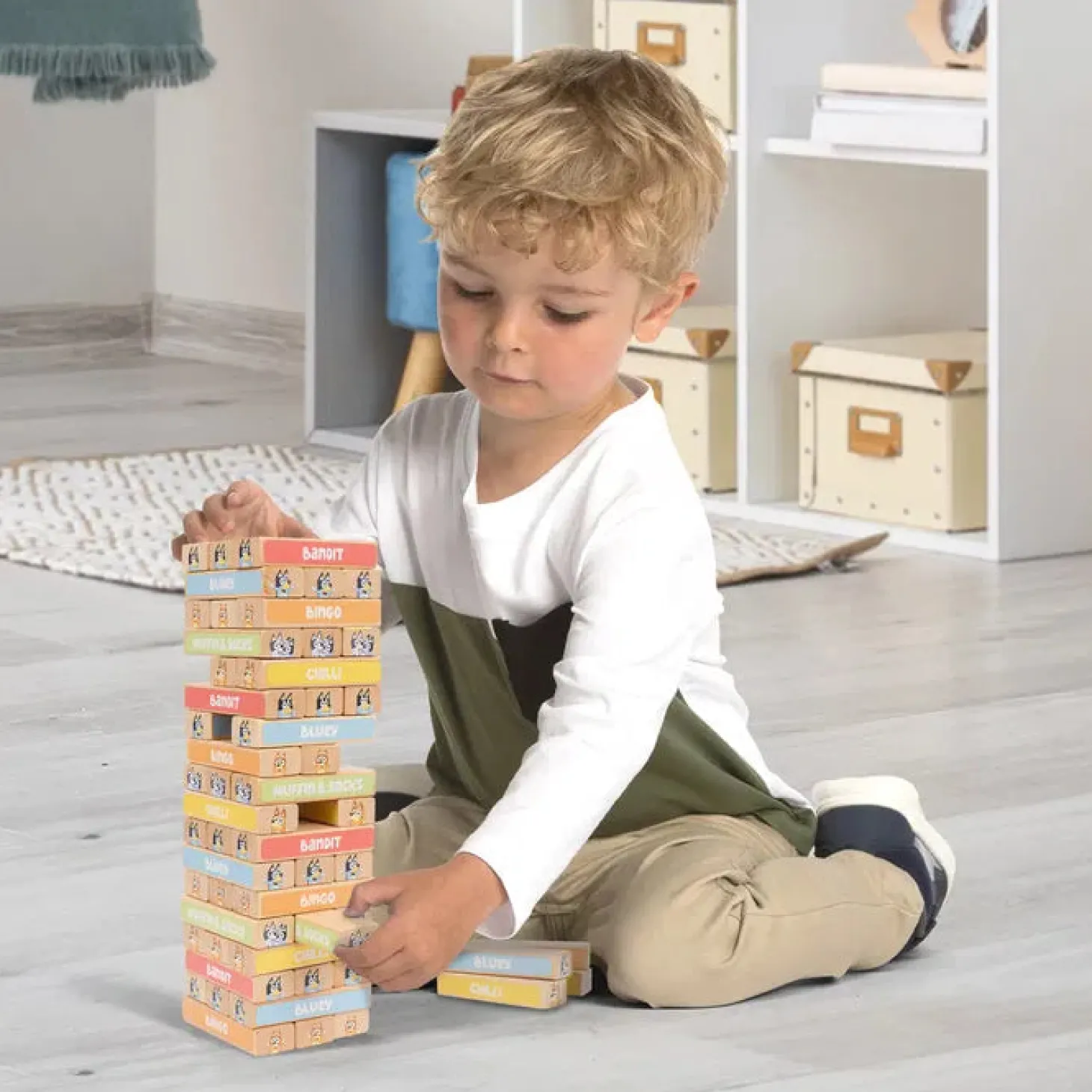 Bluey Tumle Tårn er et klassisk stabespil, hvor hver klods er dekoreret med sjove Bluey-motiver. Om det spilles alene eller med venner, vil børn nyde at teste deres koordination og strategi, mens tårnet vokser højere og højere.