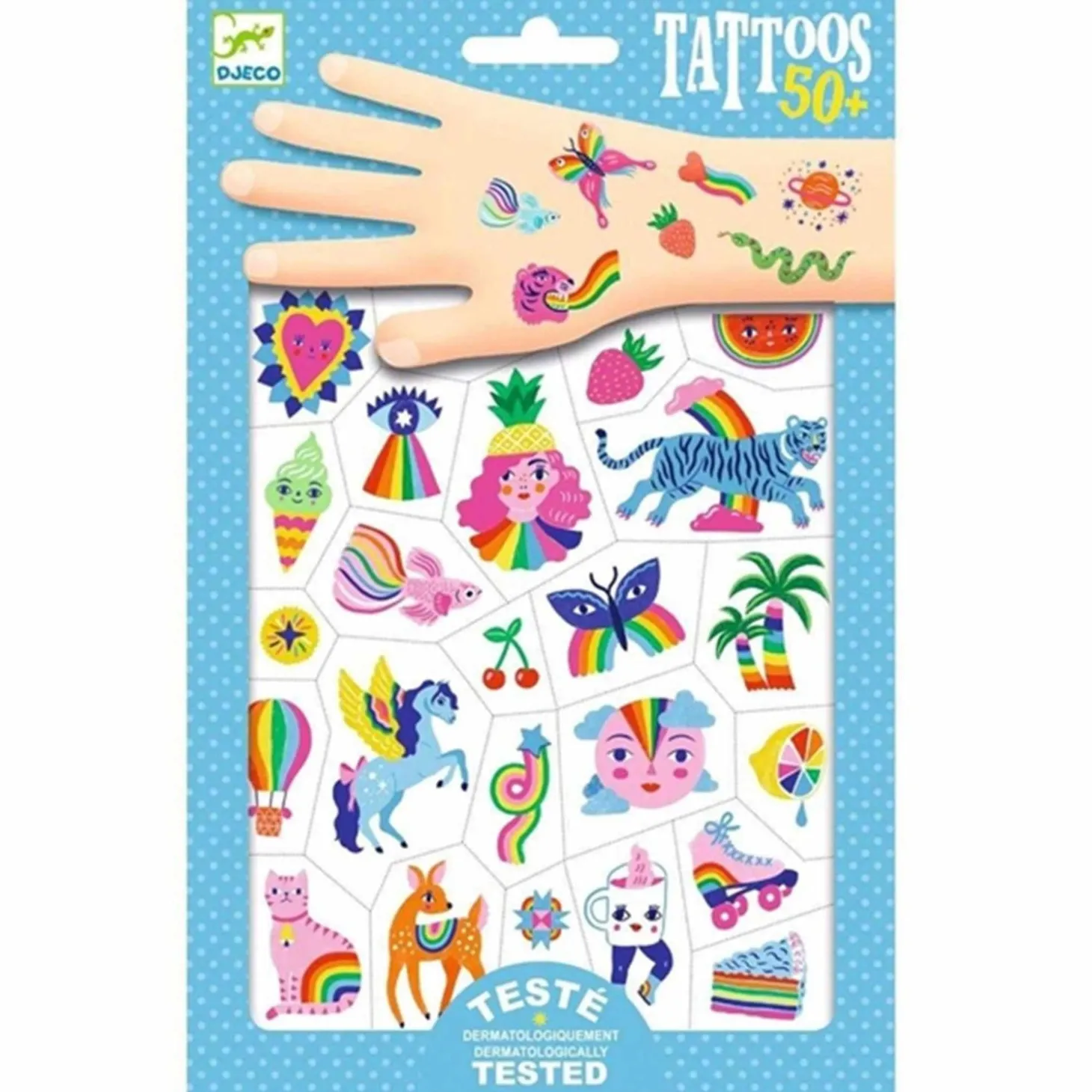 Oplev en verden af farver med Djeco Tattoos Regnbuer! Disse smukke tatoveringer kommer i to ark fyldt med fantastiske regnbuefarver og skønne motiver. Lad dine børn udforske deres kreativitet og stil med disse dermatologisk testede tatoveringer, der er sikre at bruge.