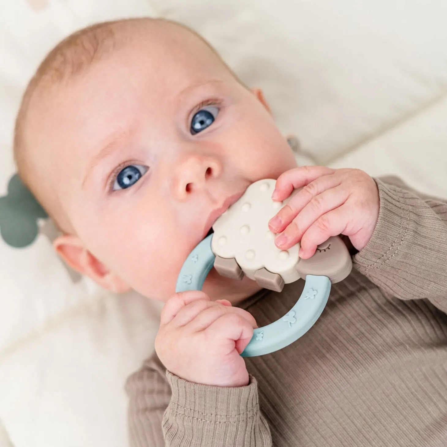 Sheepy bideringen er let at holde og har bløde materialer, der gør den behagelig for dit barn. Nem at rengøre og opbevare, er den praktisk til enhver lejlighed. Den blå ring og sandfarvede Sheepy tilføjer et sjovt element til tandplejen, mens de forskellige former og teksturer beroliger ømt tandkød.