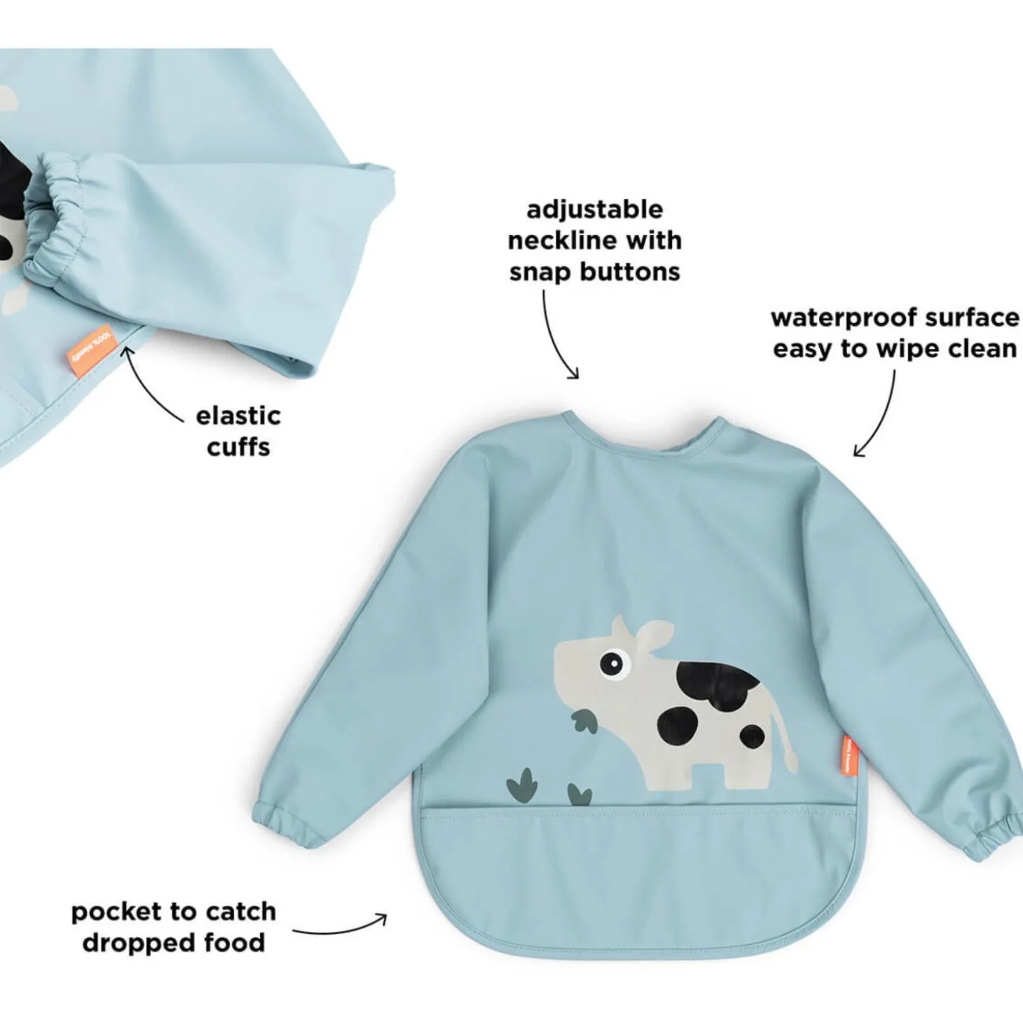 - Hagesmæk med ærmer og en lomme til at fange tabt mad
