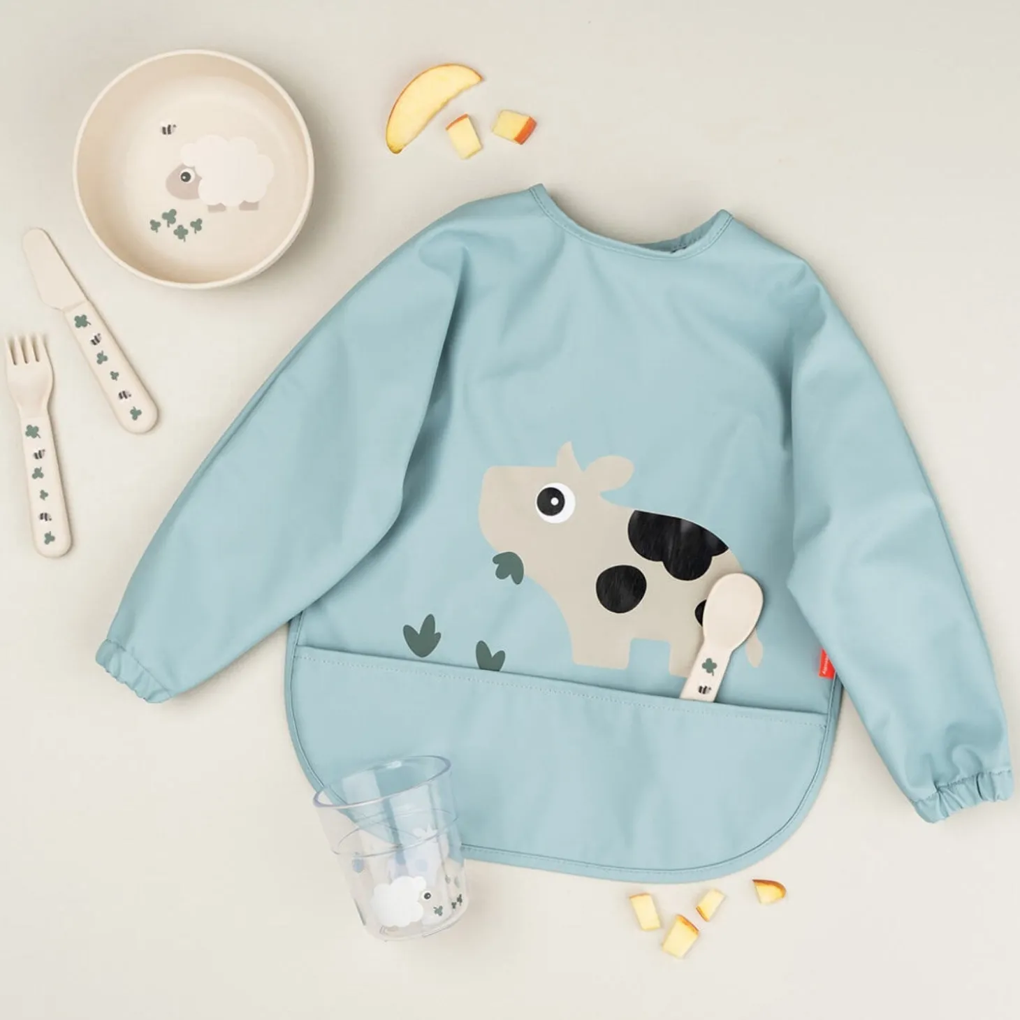 DonebyDeer Blå Hagesmæk m/Ærmer og lomme Tiny farm er den perfekte følgesvend til dit barns måltider! Med fokus på sikkerhed og komfort er denne hagesmæk certificeret til at opfylde høje standarder, så du kan have ro i sindet.