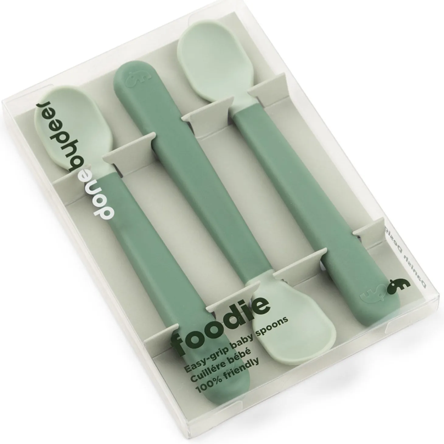 Opdag en ny måde at gøre måltider sjovere for din lille én med denne 3-pak af DonebyDeer Foodie Easy-Grip babyskeer i forfriskende grønne farver. De søde skeer er designet med et lille blad, perfekt til babyens første mundfuld, og har et skaft med blød easy-grip-belægning, der giver en stabil og behagelig greb for små hænder.