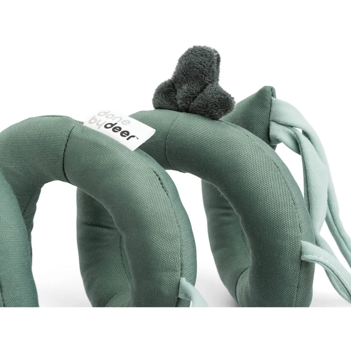 Med sensoriske elementer som en rangle, en klokke og knitren, stimuleres dit barns hørelse og taktile sanser. Lad din baby udforske sig selv og sine refleksioner i spejlet. Den lette spiral kan bindes på sengen, autostolen eller barnevognen og har en sej grøn farve med farverige detaljer og kontraster for visuel stimulering. Deer friends underholder dit barn, mens I er på farten.