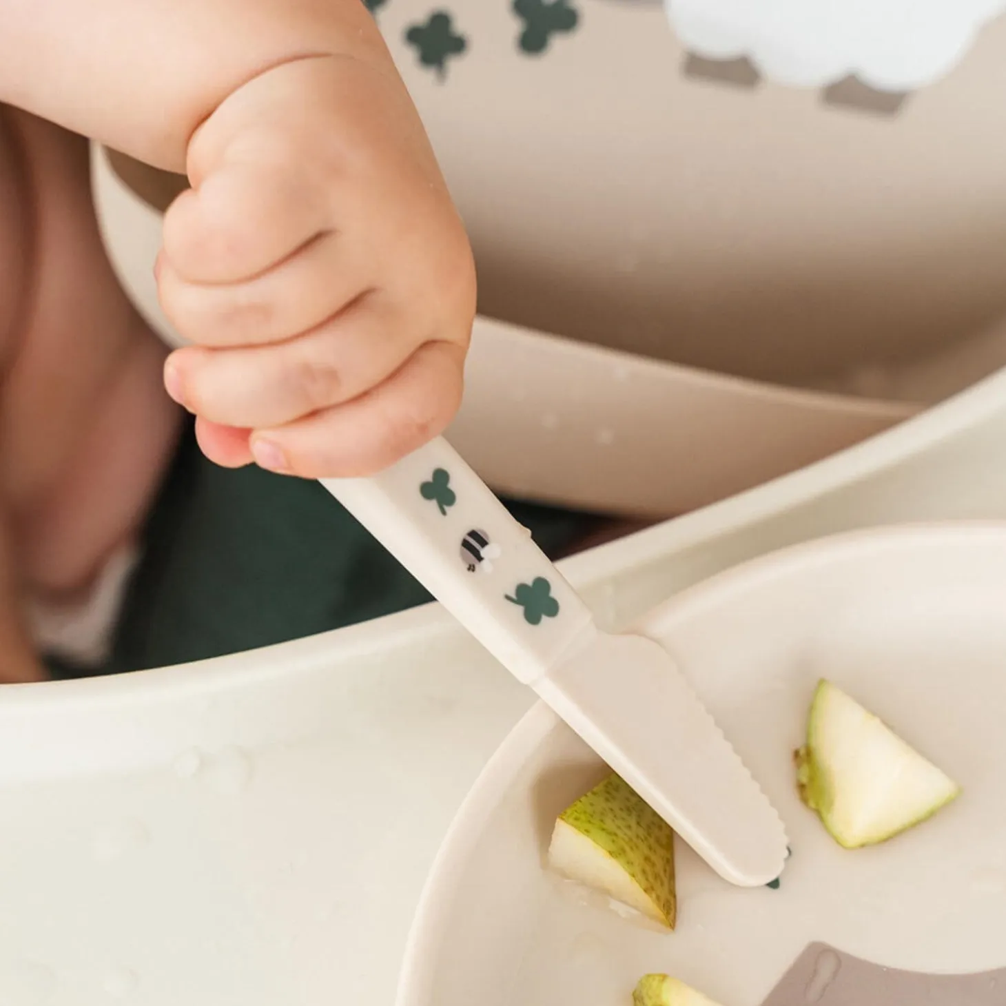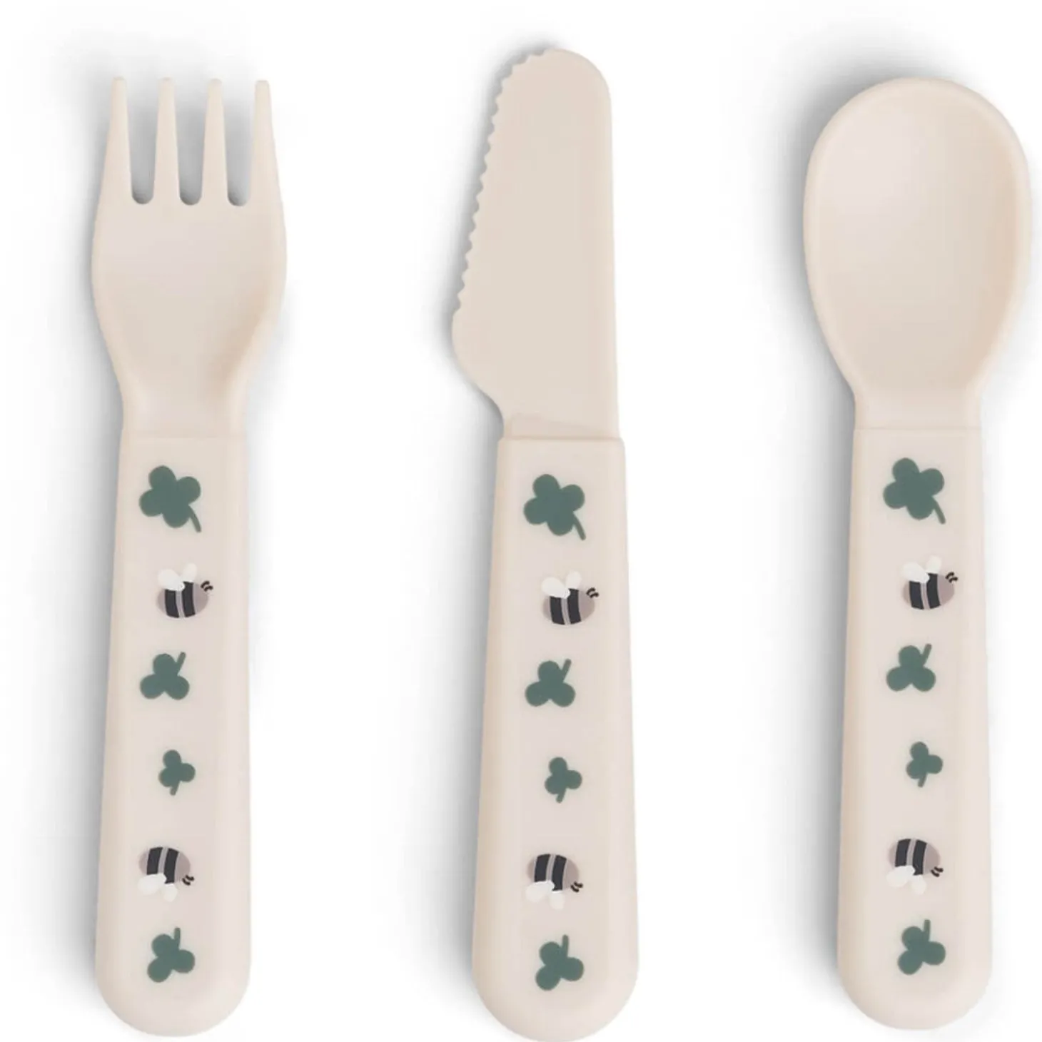 Produktet er lavet af 100% fødevaregodkendt PP og måler 12 x 2 x 1 cm. Velegnet til børn fra 0 år og opefter. Bestik og skeer er designet med bløde, afrundede kanter for ekstra sikkerhed. De er fremstillet af BPA-frit materiale og kan både bruges i mikrobølgeovn og vaskes i opvaskemaskinen. Den fine sandfarve med kløvermotiv giver en charmerende touch til måltidstiden.