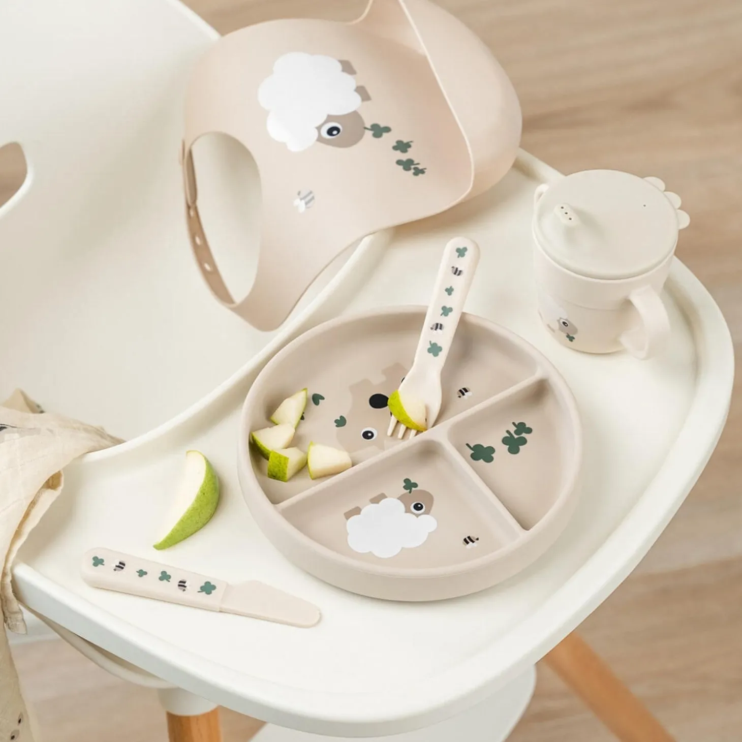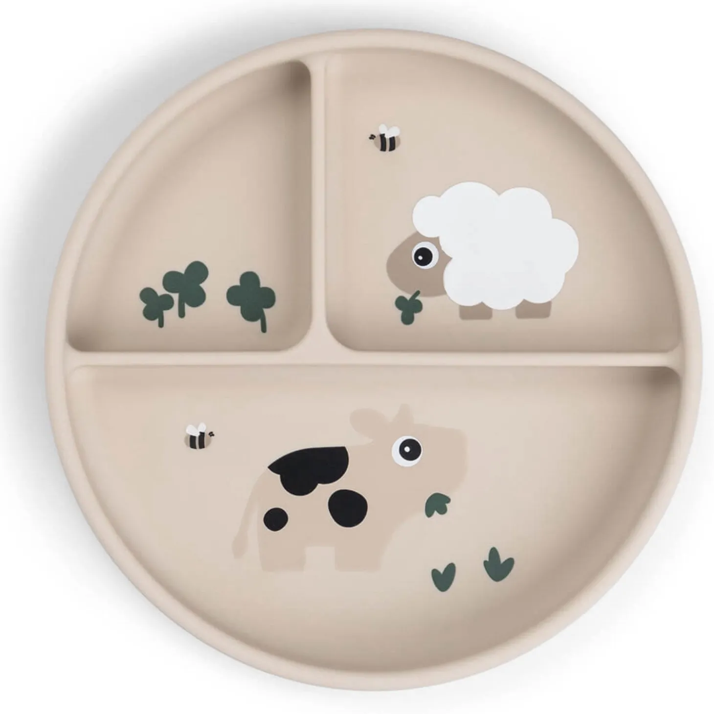 Med en praktisk base med sugekop forhindrer denne tallerken dit barn i at skubbe, vippe eller kaste tallerkenen. Den er fri for BPA og andre skadelige stoffer, samt sikker at bruge i mikroovn, ovn og fryser. Let at rengøre i opvaskemaskinen anbefales det at bruge parfumefri sæbe til silikone. Den holdbare tallerken har en fin sandfarve med et underholdende motiv af Sheepy og Dotti, der vil inspirere dit barn til at udforske madens verden.