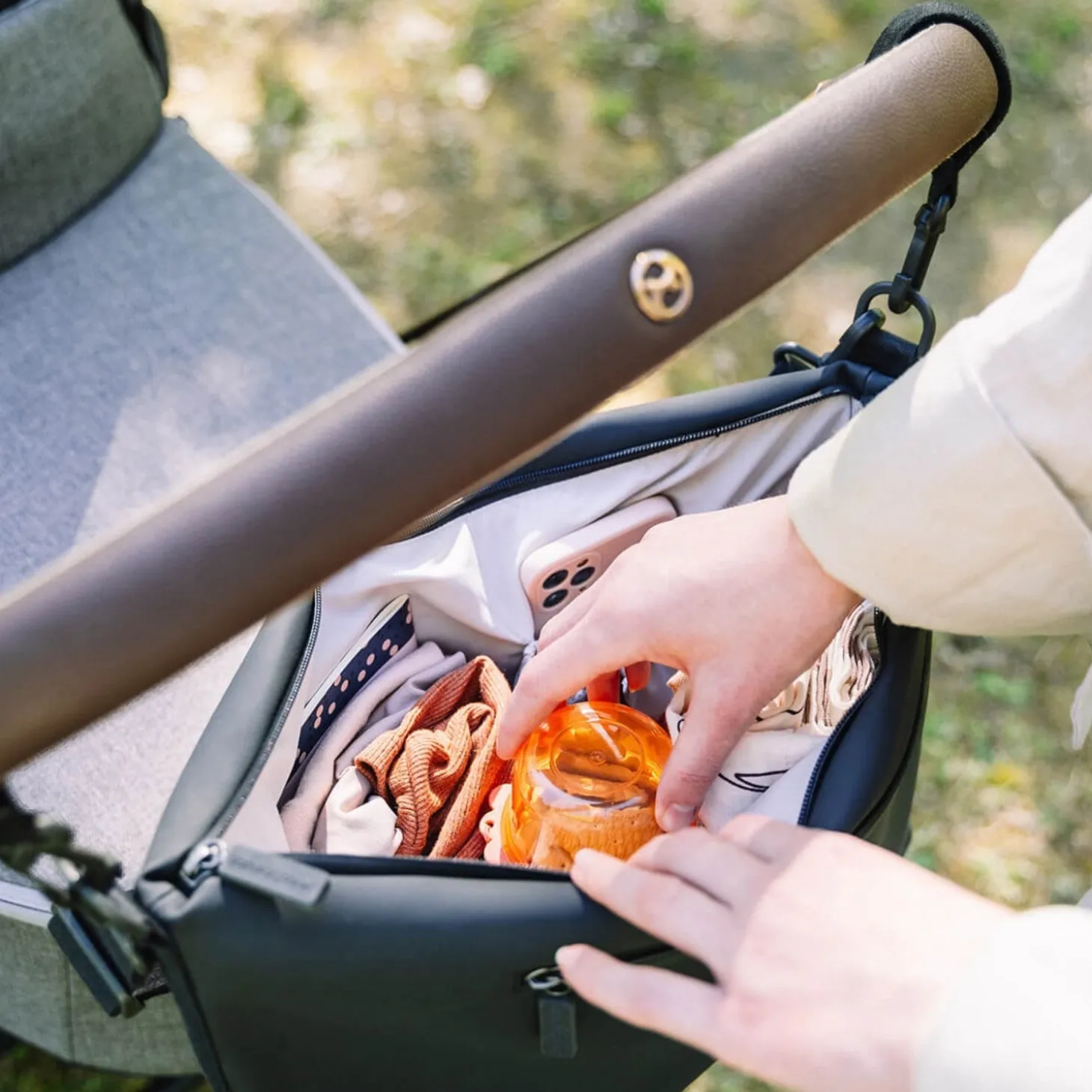 Tasken er designet med en fleksibel, bred skulderrem for komfort, og dens vandafvisende overflade sikrer, at alt forbliver tørt og sikkert, uanset vejret. En ideel følgesvend til det moderne forælderliv.