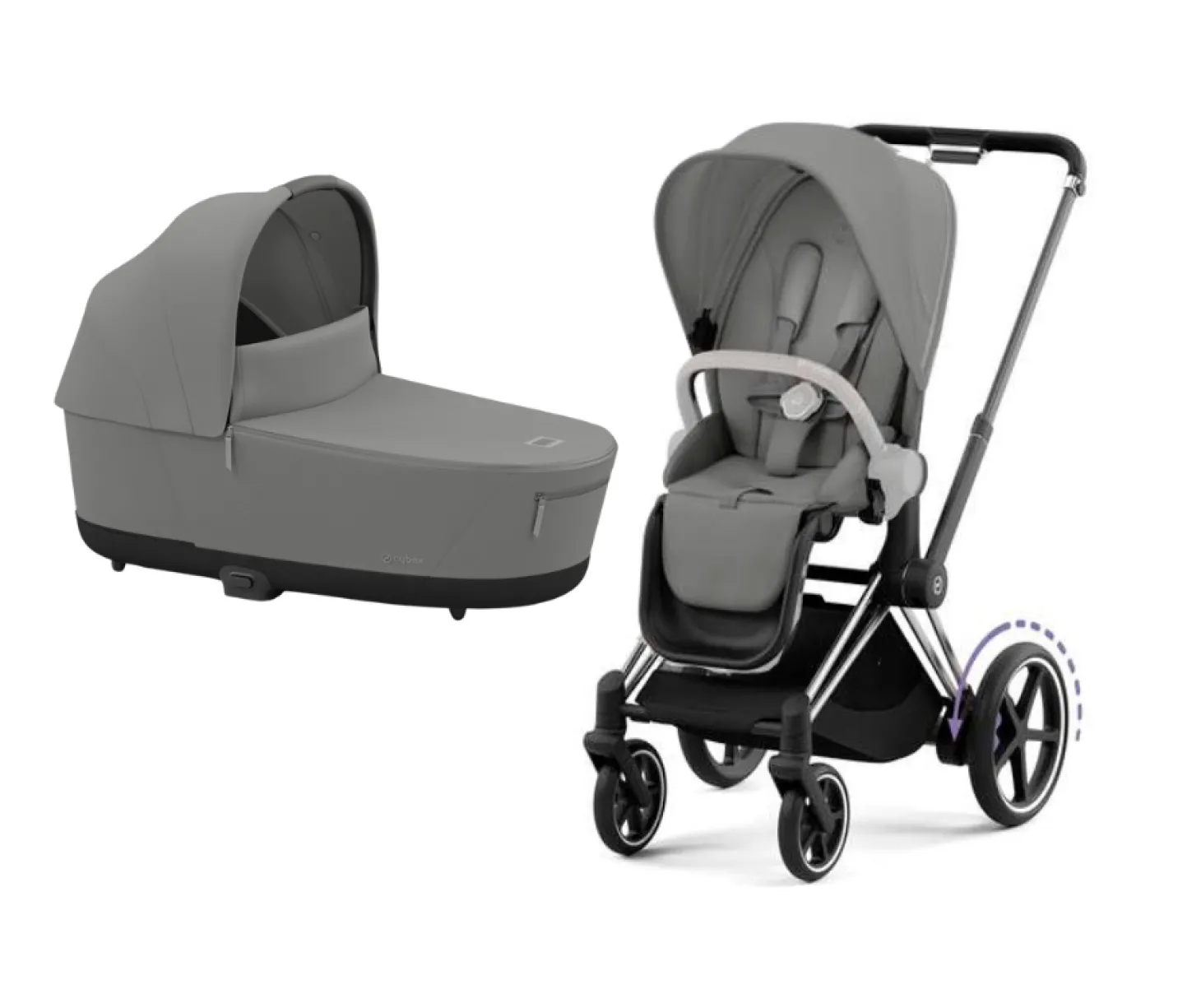 Her får du en Lux barnevognskasse, E-priam stel (med vuggefunktion), samt klapvognsbetræk i matchende farve: Mirage Grey, stel i farven chrome black.