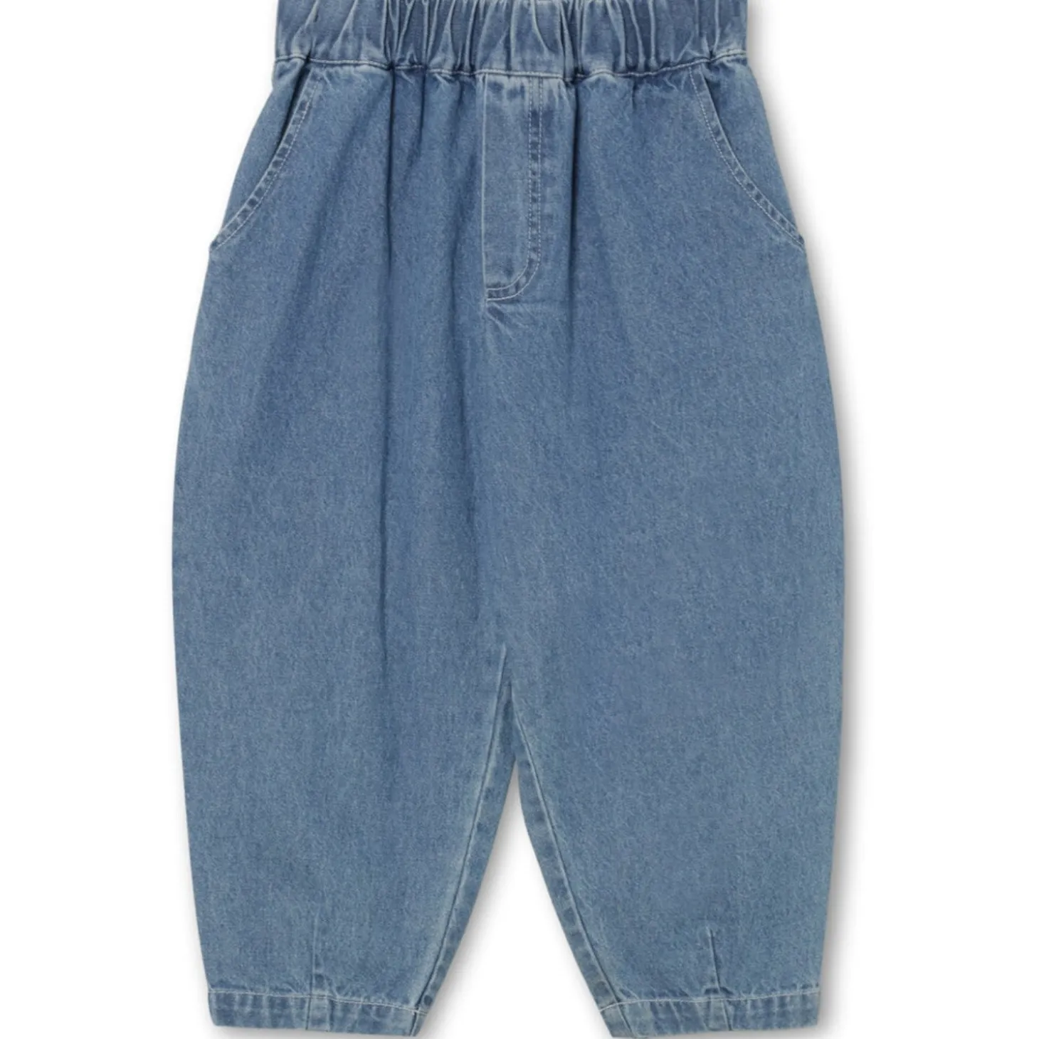 Den lyse denimblå farve er klassisk og alsidig, nem at matche med barnets yndlingstrøjer. Sidelommerne er perfekte til at gemme små skatte, som barnet finder på eventyr udendørs. For at pleje bukserne, anbefales maskinvask ved 30 °C og kort centrifugering ved halv fyldning. Undgå blegning, tørring i tørretumbler og rensning for at bevare form og farve.