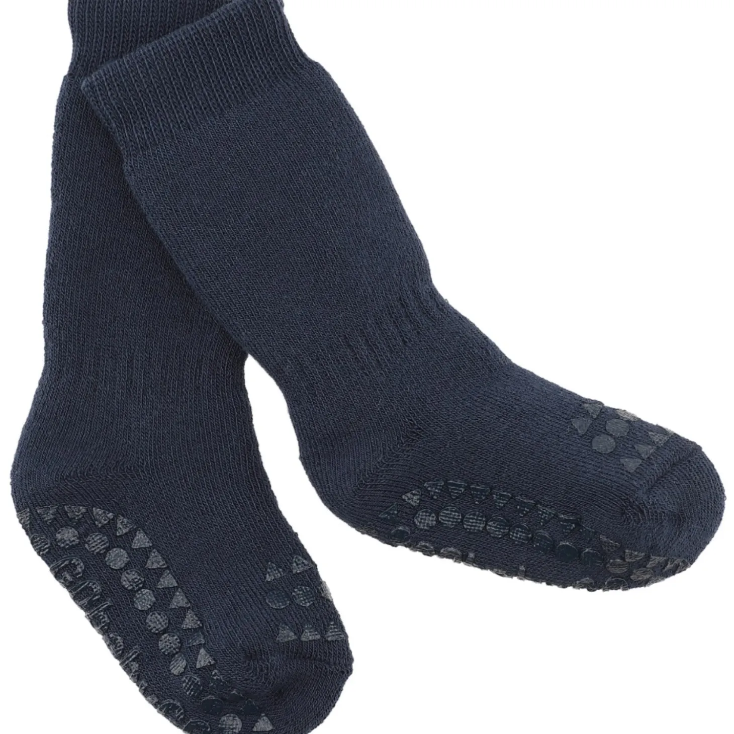 Giv dit barn tryghed i de første skridt med GoBabyGo’s navyblå skridsikre strømper. Disse strømper er lavet af økologisk frottébomuld, som sikrer blødhed og varme. De har indarbejdede gummipuder under fødderne og på tæerne, der forhindrer glidning på glatte overflader, hvilket gør dem ideelle til aktive børn, der lærer at kravle og gå.