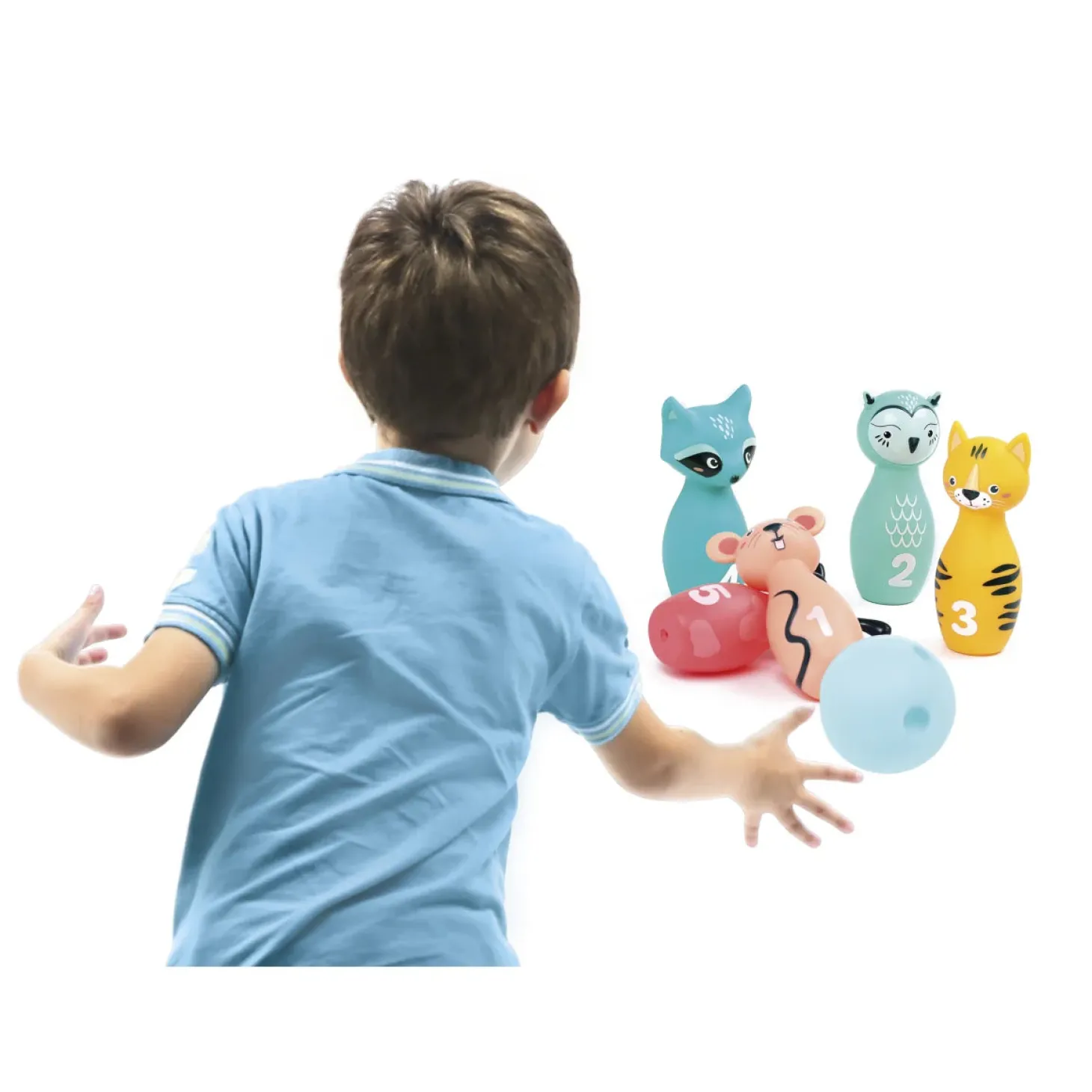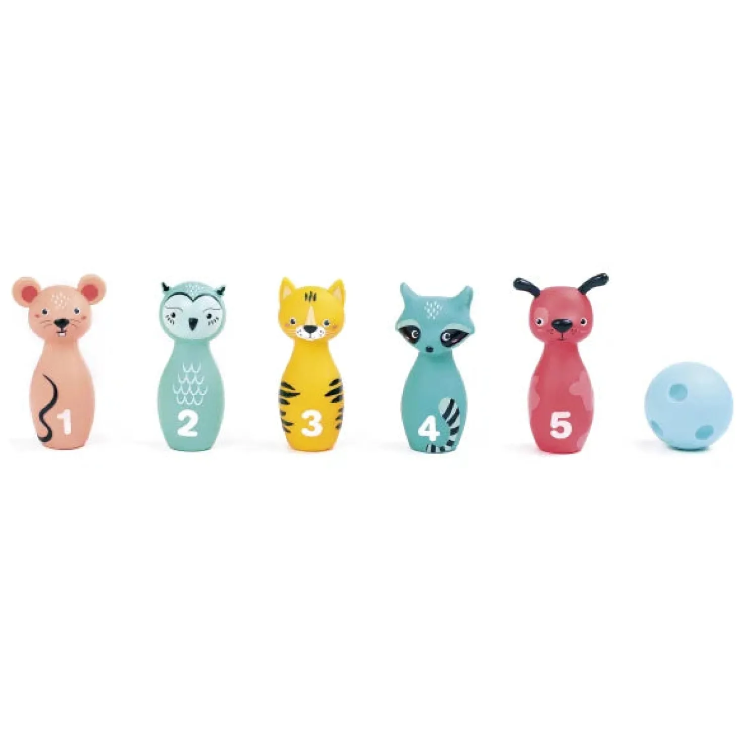 Farverigt bowlingsæt med dyre-kegler. Dette bowlingsæt har et sjovt, børnevenligt design og giver masser af sjov leg. Barnet får styrket deres motorik og koordination samtidig med, at de har det sjovt. Sættet består af 5 kegler og en 1 bold. Barnet kan spille alene eller sammen med andre. Alder: +10 mdr. Emballage størrelse: 20 x 15 x 14 cm. Produkt størrelse: 6 x 15 x 6 cm. Materiale: PVC