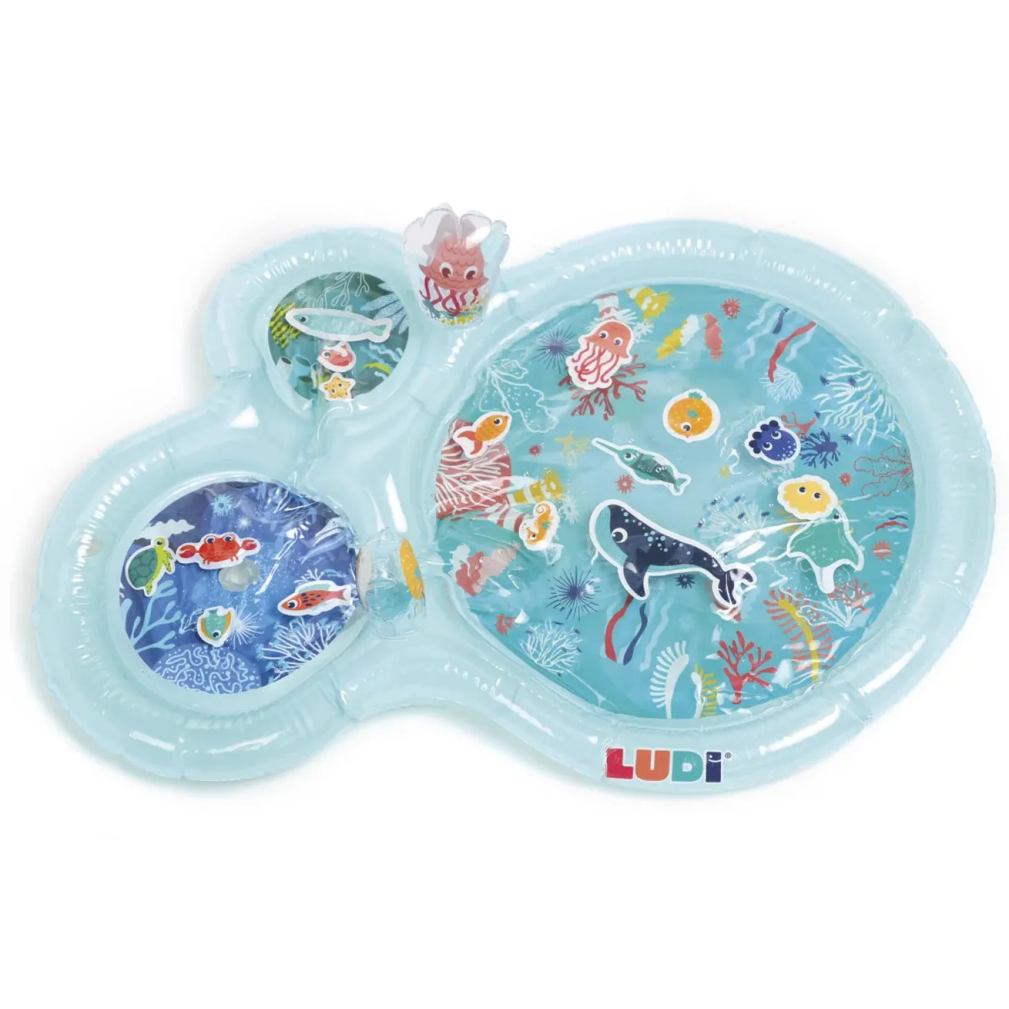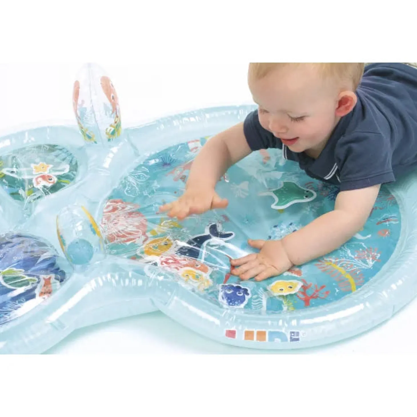 Flot vandlegemåtte. Denne vandlegemåtte drager børn ind i en undervandsverden og er ideel til at udvikle motoriske færdigheder og vække barnets sanser. Måtten skal pustes op og fyldes med vand. Når barnet kravler rundt på måtten bevæger de forskellige dele sig i vandet under barnet. Marine-verdenen kan beundres med de forskellige undervandsdyr som fisk, skildpadde, blæksprutte, søhest og søstjerne. Der er to oppustelige håndtag som er nemme for barnet at få fat i. De udsender en lille lyd af en klokke eller en fløjte, når de bliver klemt på. Legemåtten fremmer syns- og høresansen, fingerfærdighed og stimulerer fantasien. Alder: +10 mdr. Produkt størrelse: 94 x 20 x 63. Materiale: 100% PVC