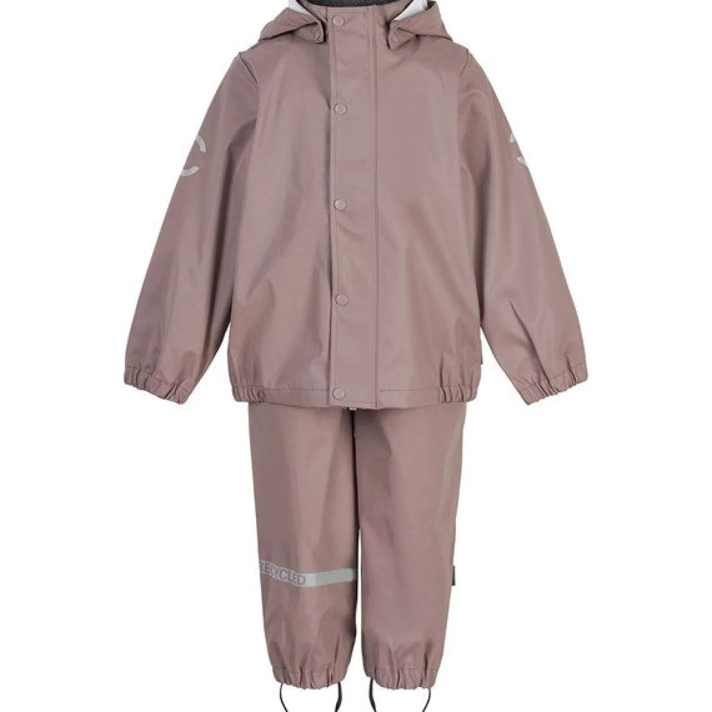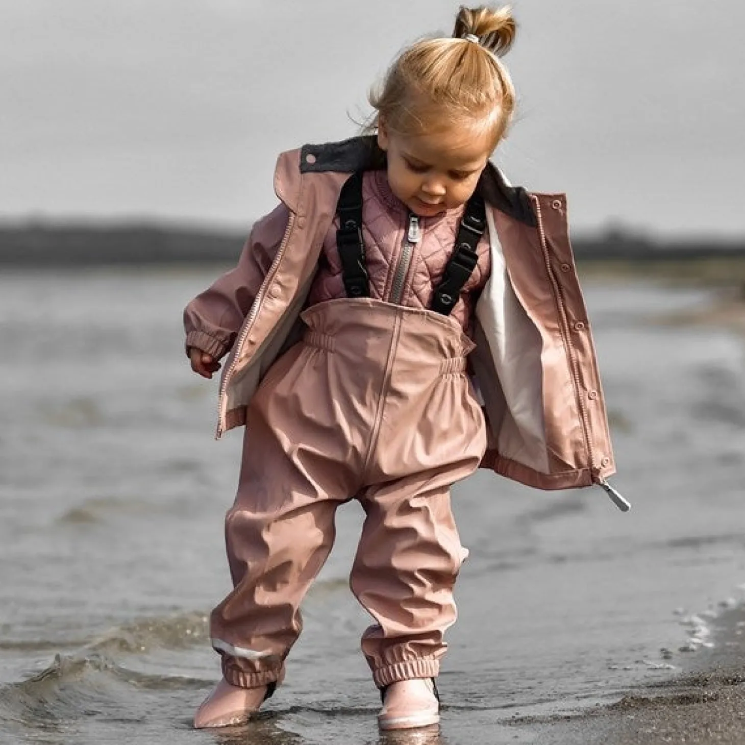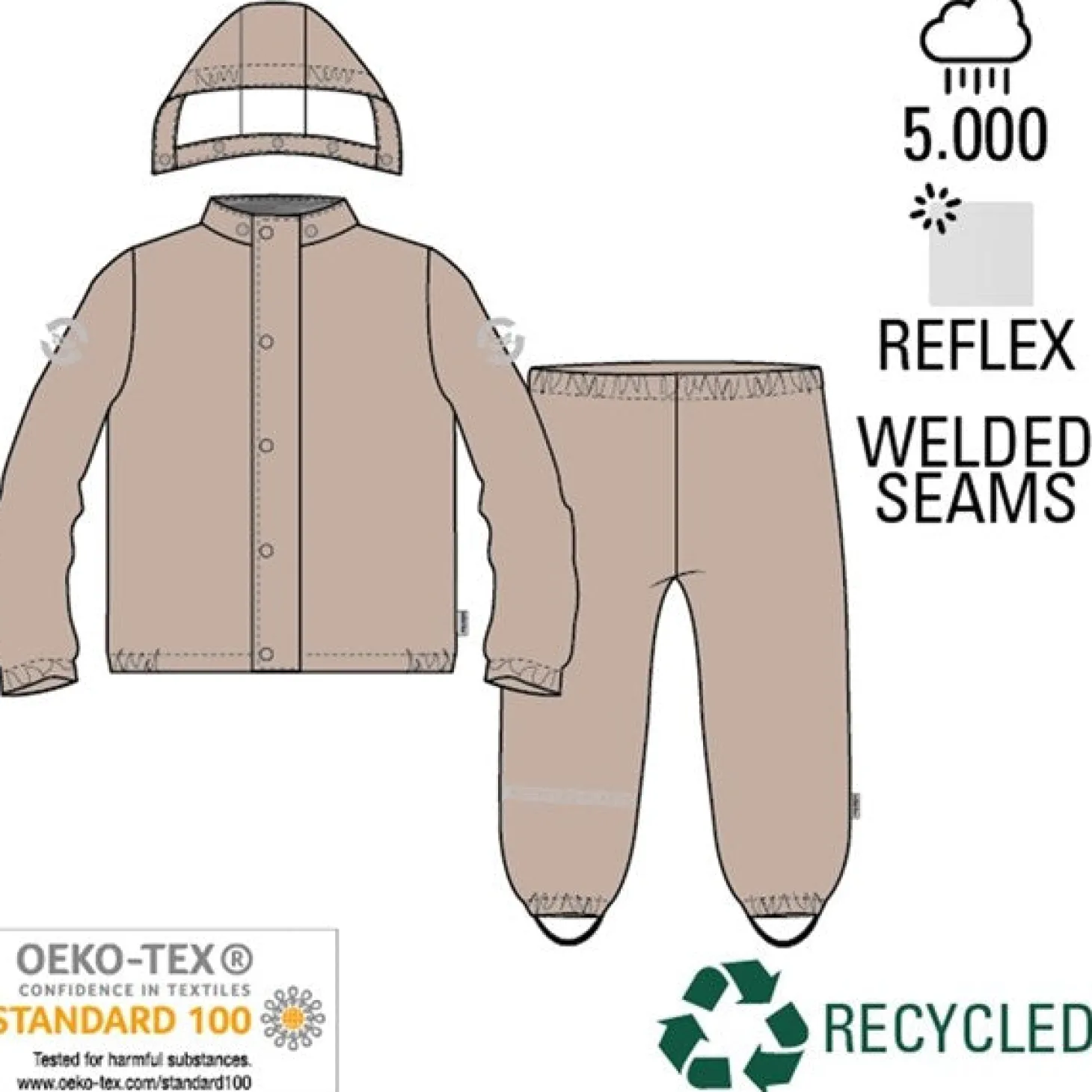 Jakken har en lynlås, trykknaplukning, hagebeskyttelse og en aftagelig hætte, mens bukserne har en justerbar talje for perfekt pasform. De justerbare fodstropper og elastikkanter holder regnen ude, mens børnene leger og hopper i vandpytter.