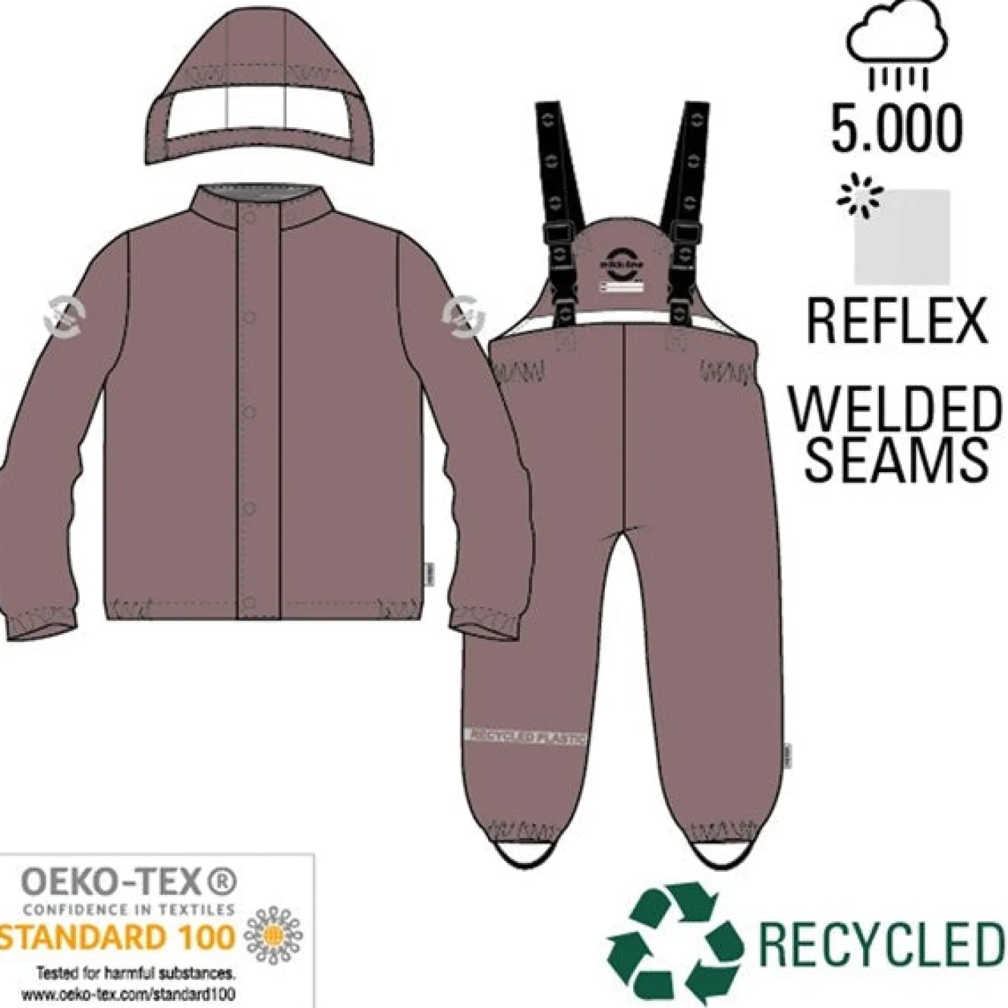Dette regntøj er ikke kun vind- og vandtæt med svejsede sømme, det er også OEKO-TEX 100 certificeret og lavet af genbrugsmateriale, hvilket gør det til et bæredygtigt valg. Praktiske reflekterende detaljer, navnemærke indvendigt og nikkel-fri metal gør det til det ideelle valg for aktive børn, der elsker at lege udendørs.