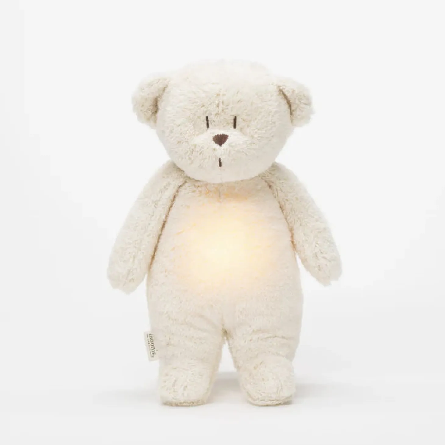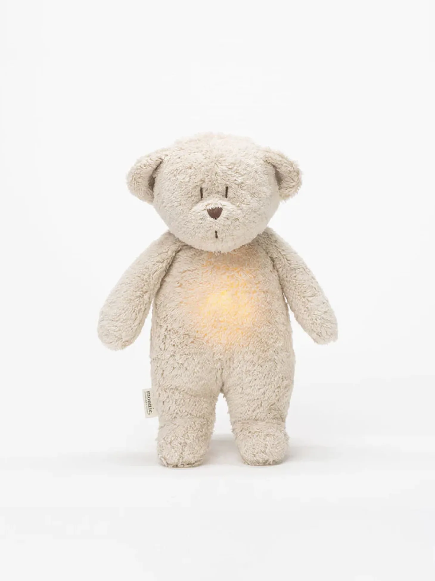 Moonie Bjørnen 2.0 er fremstillet i økologisk bomuld og udstyret med genopladelig lyd- og lysmodul. Den er nem at bruge, sikker for selv nyfødte og en smuk del af både soveværelset og hverdagen.
