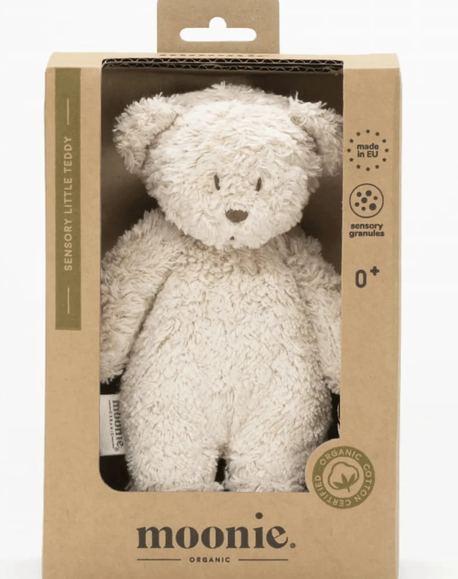 Den lille Moonie bamse er lavet af økologisk bomuld og har en perfekt størrelse til en lille hånd.