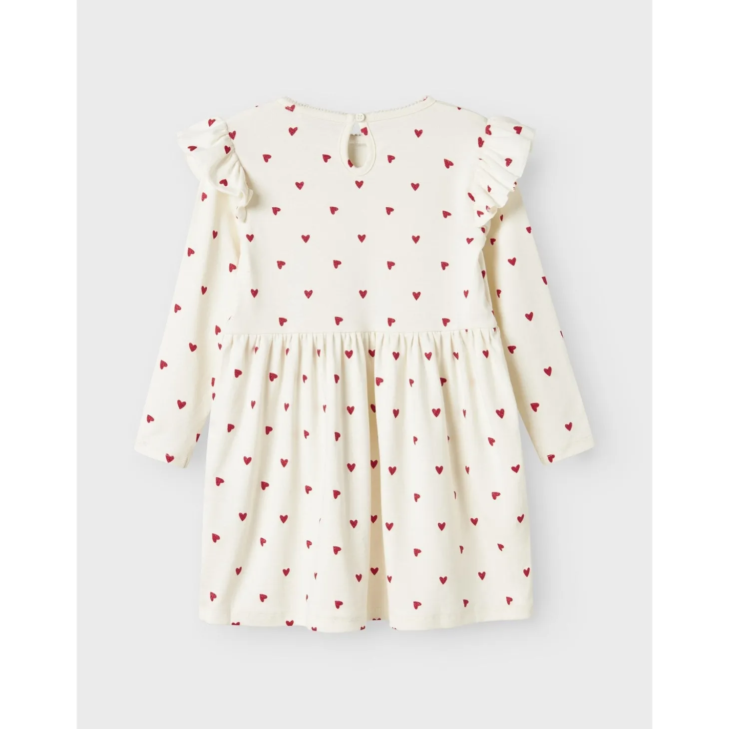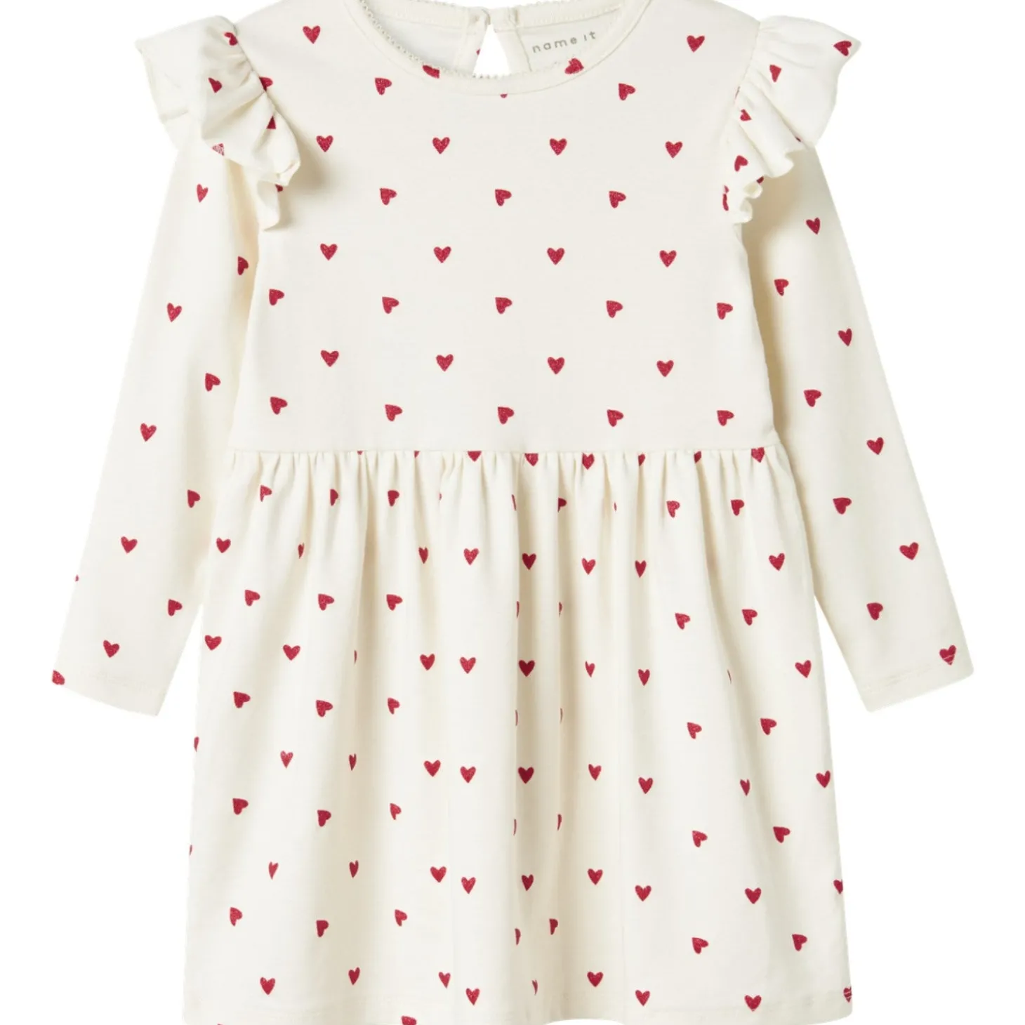 Gør din lille fashionista klar til enhver lejlighed med Name It Cloud Dancer Dheart Kjolen. Denne kjole er lavet af blødt ribstrikket materiale, der ikke kun giver optimal komfort takket være sin elasticitet, men også præsenterer et tidløst lodret stribet mønster. Farven ‘Cloud Dancer’ sammen med de glitrende detaljer og søde flæser tilføjer et legende og stilfuldt touch. Kjolen har en behagelig rund halsudskæring, lange ærmer og en standard pasform, hvilket gør den ideel til både hverdag og festlige begivenheder. Det søde gentagne mønster over hele stoffet fuldender looket. En perfekt kombination af stil og funktionalitet, der holder din lille varm og sød på kølige dage.