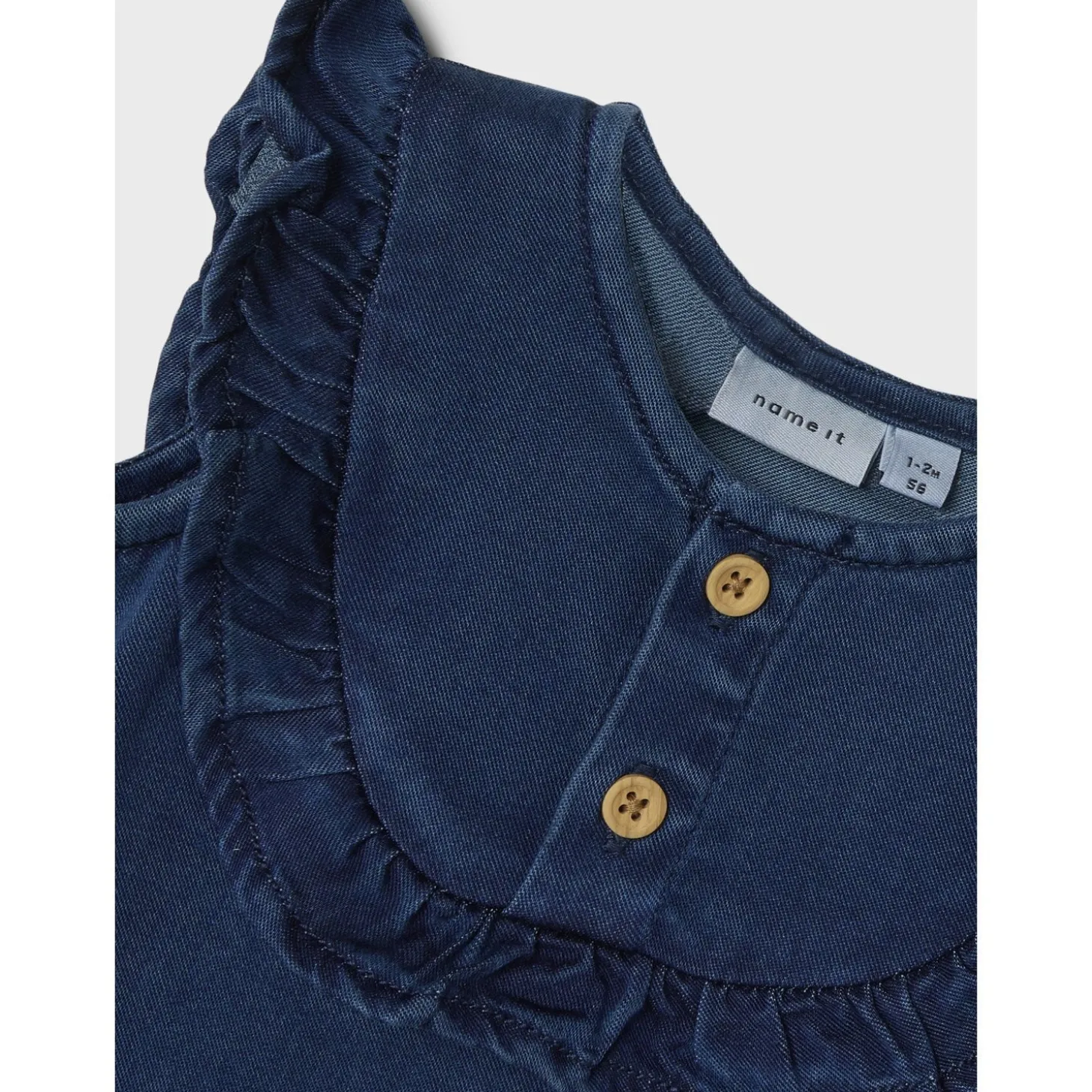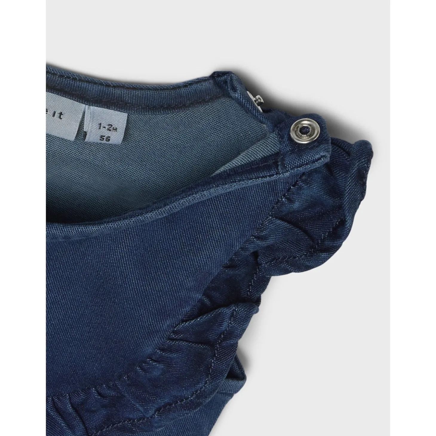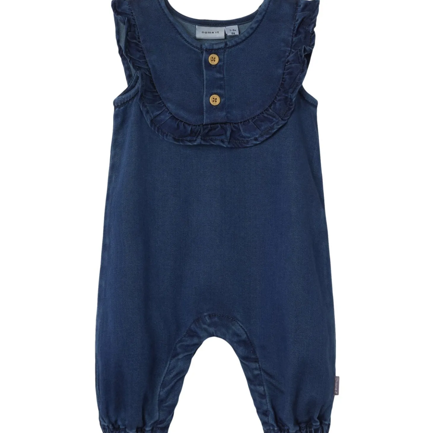 Med en klassisk mørkeblå farve og trendy flæser tilføjer denne dragt et legesygt og unikt touch til dit barns garderobe. Praktiske trykknapper i skridtet gør påklædning og afklædning en leg, perfekt til travle dage. Elastiske kanter sikrer en behagelig pasform, mens den almindelige pasform giver masser af bevægelsesfrihed.