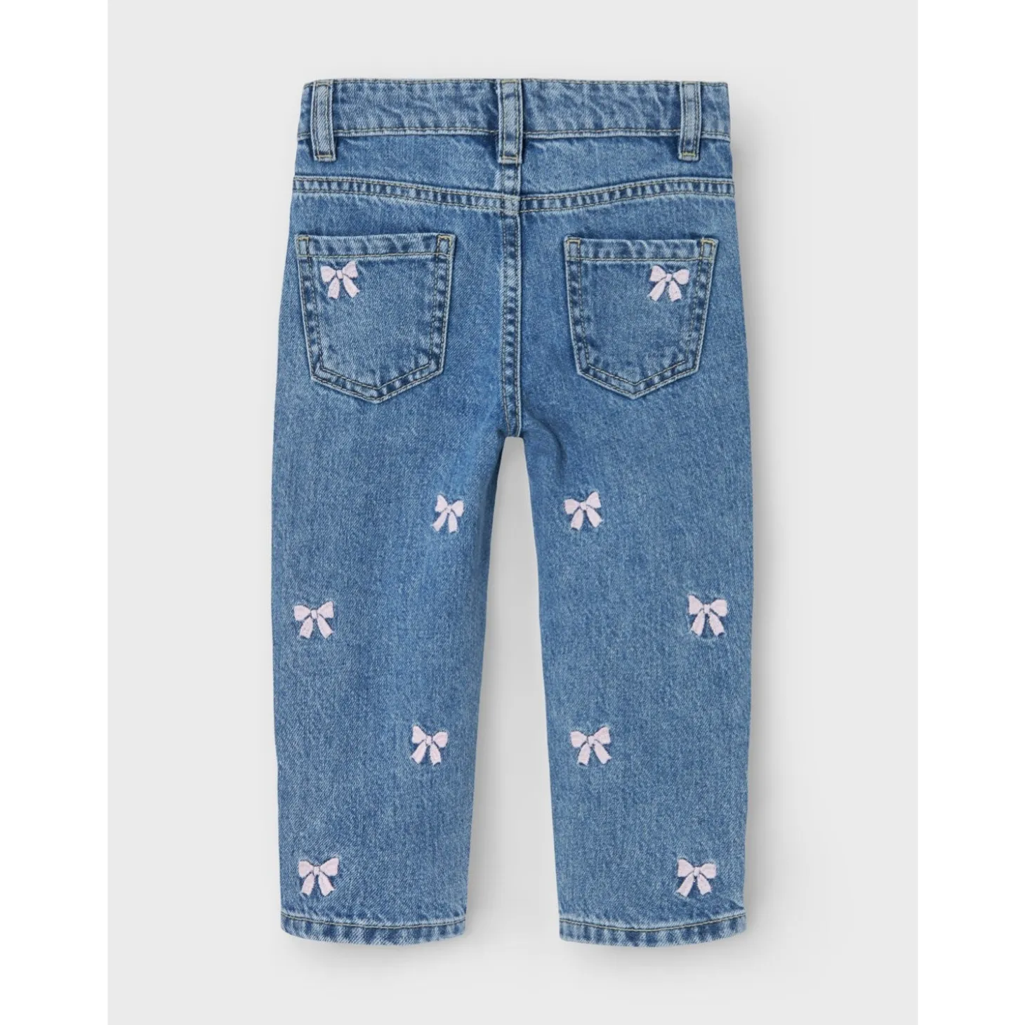 Opgrader dit barns stil med disse moderigtige Name It Medium Blue Denim Bows Bella Mom Embroidery Jeans Noos. Lavet af slidstærkt denimstof med et unikt broderimønster, tilbyder disse jeans en legende finesse og holdbarhed. Med en mom fit pasform, har de en baggy hofte og en fashionable silhuet, perfekt til enhver lejlighed.