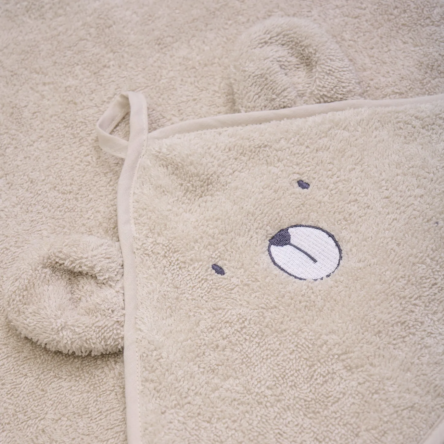 Håndklæde med hætte i blød frotté. Perfekt til at tørre og holde barnet varmt efter badet. Certificeret i hht. OEKO-TEX® STANDARD 100 Cert. No. 2276-364 DTI