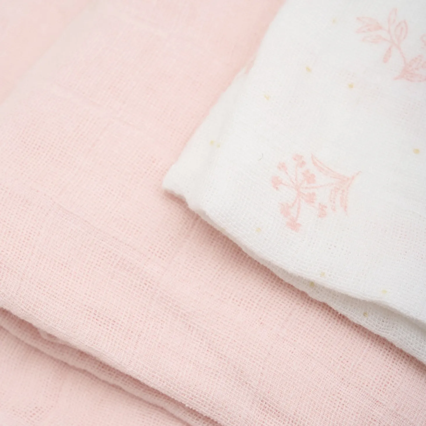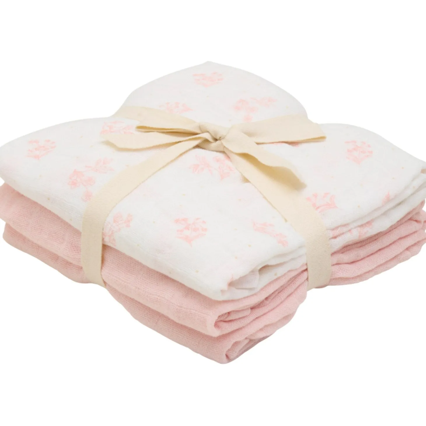 Sættet inkluderer en ensfarvet og to trykte bleer, hver måler 60×65 cm og er designet til alsidig brug – fra amning til aftørring. Med let vedligeholdelse bevarer de deres form selv efter gentagen vask og kan nemt foldes for organiseret opbevaring.